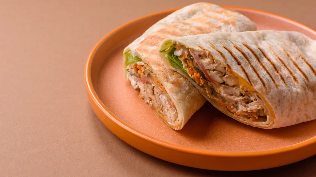 Schawarma mit Hähnchen oder Rindfleisch, Tortilla-Rolle und Gemüse. Schawarma mit Fleisch Shawarma with chicken or beef, tortilla roll, and vegetables. Shawarma with meat and vegetables as a food b...