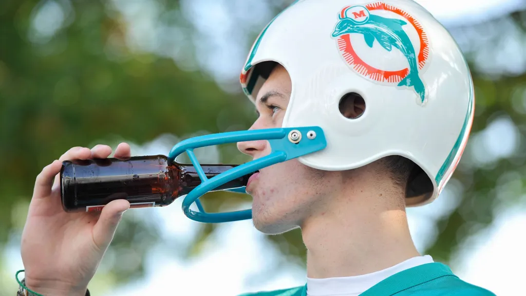 Mandatory Credit: Photo by Joe Toth BPI Shutterstock (5212756i) A Miami Dolphins fan tries to drink a beer through his helmet during the NFL, American Football Herren, USA Week 4 game between Miami...