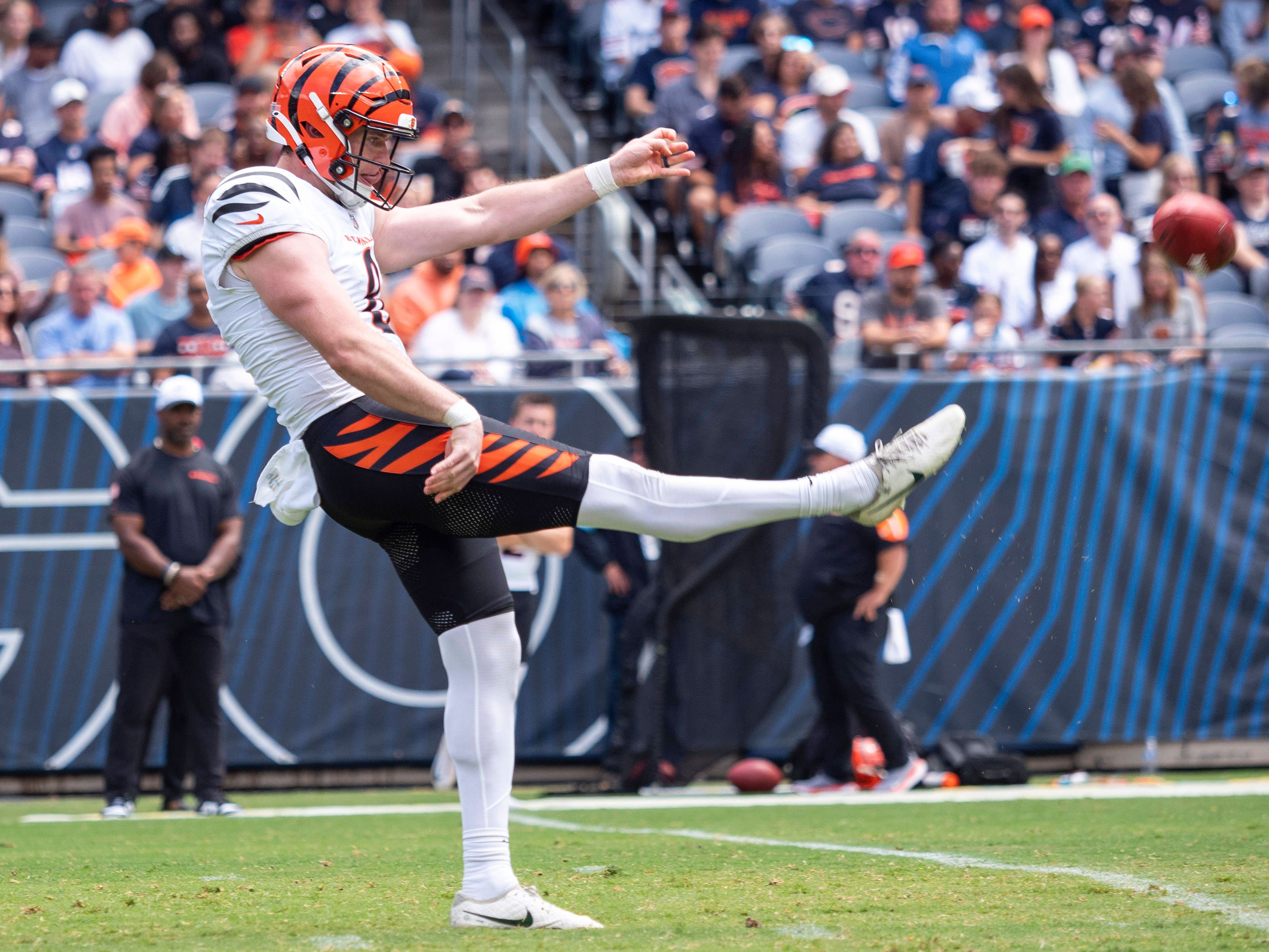 CHICAGO, IL - AUGUST 17: Cincinnati Bengals punter Ryan Rehkow (8) punts the ball during a preseason game between the Cincinnati Bengals and the Chicago Bears on August 17, 2024, at Soldier Field i...