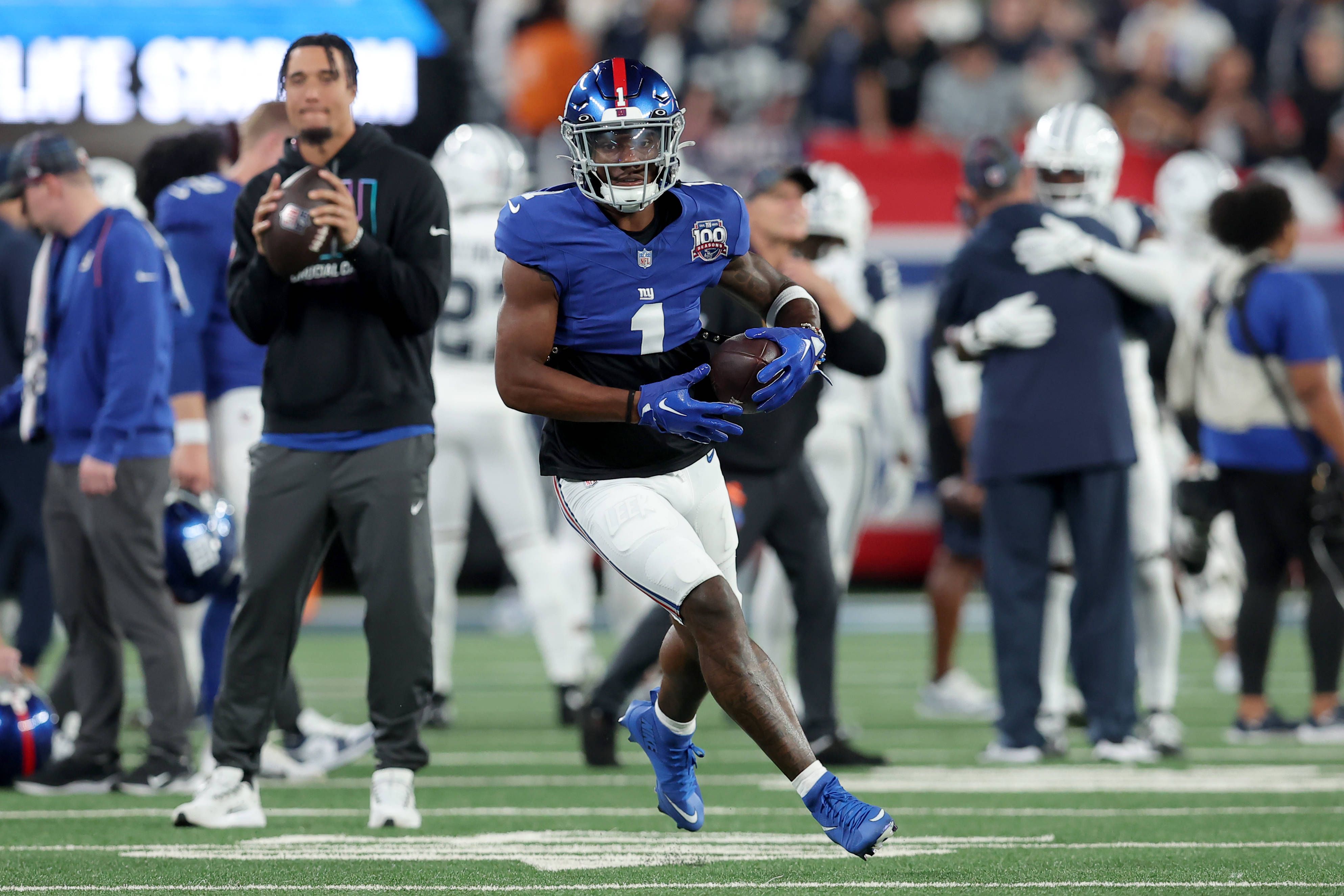 NFL, American Football Herren, USA Dallas Cowboys at New York Giants Sep 26, 2024; East Rutherford, New Jersey, USA; New York Giants wide receiver Malik Nabers (1) warms up before a game against th...