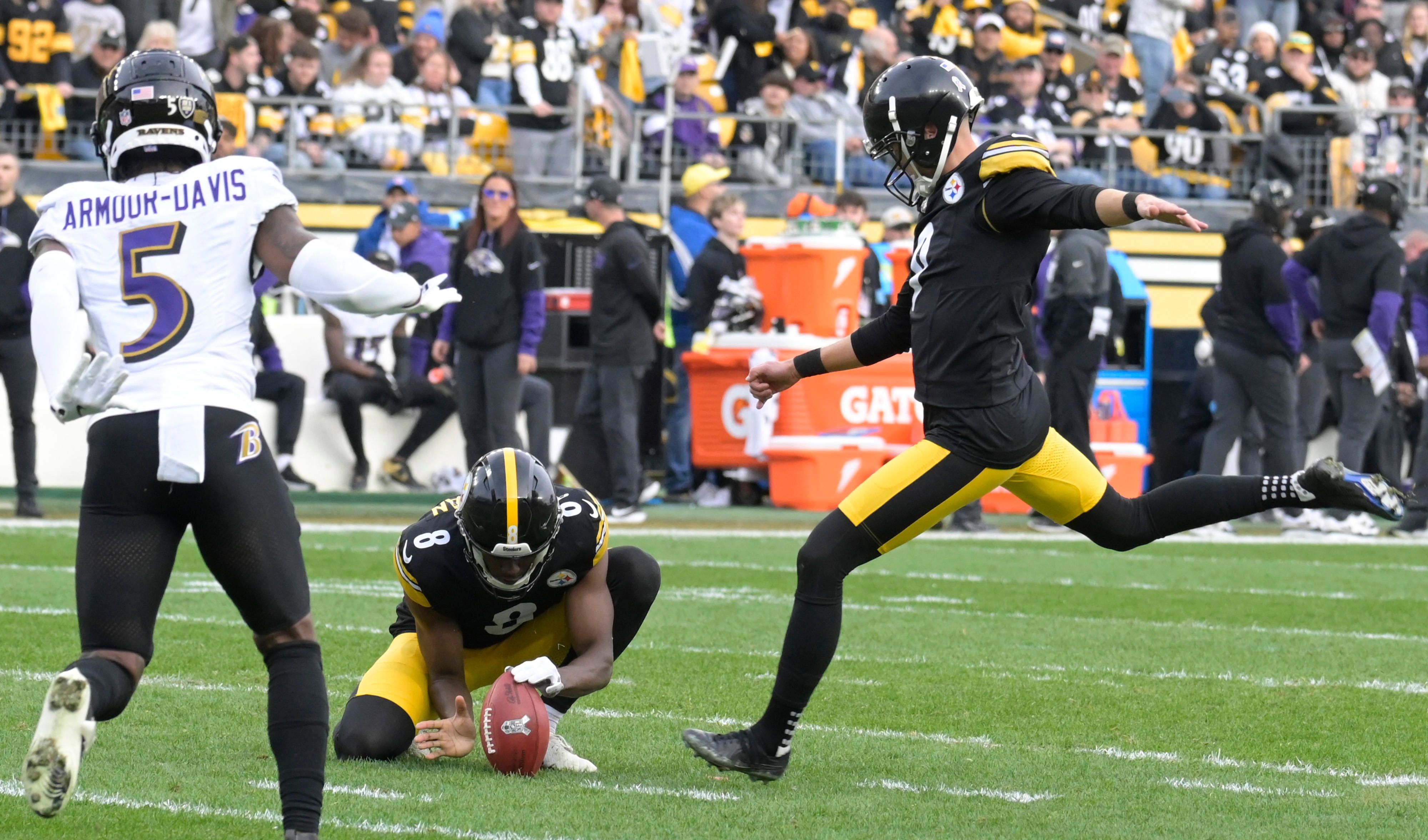 Beim 18:16-Sieg der Steelers gegen die Ravens war Steelers-Kicker Chris Boswell mit sechs Field Goals für alle Punkte seines Teams verantwortlich. Der 33-Jährige ist damit der erste Spieler in der NFL-Historie, der in drei Karrierespielen sechs Field Goals erzielt hat. Zudem ist er neben John Carney (1993) der einzige Kicker, der in einer Saison mehrere solcher Spiele absolviert hat.IMAGO/UPI Photo