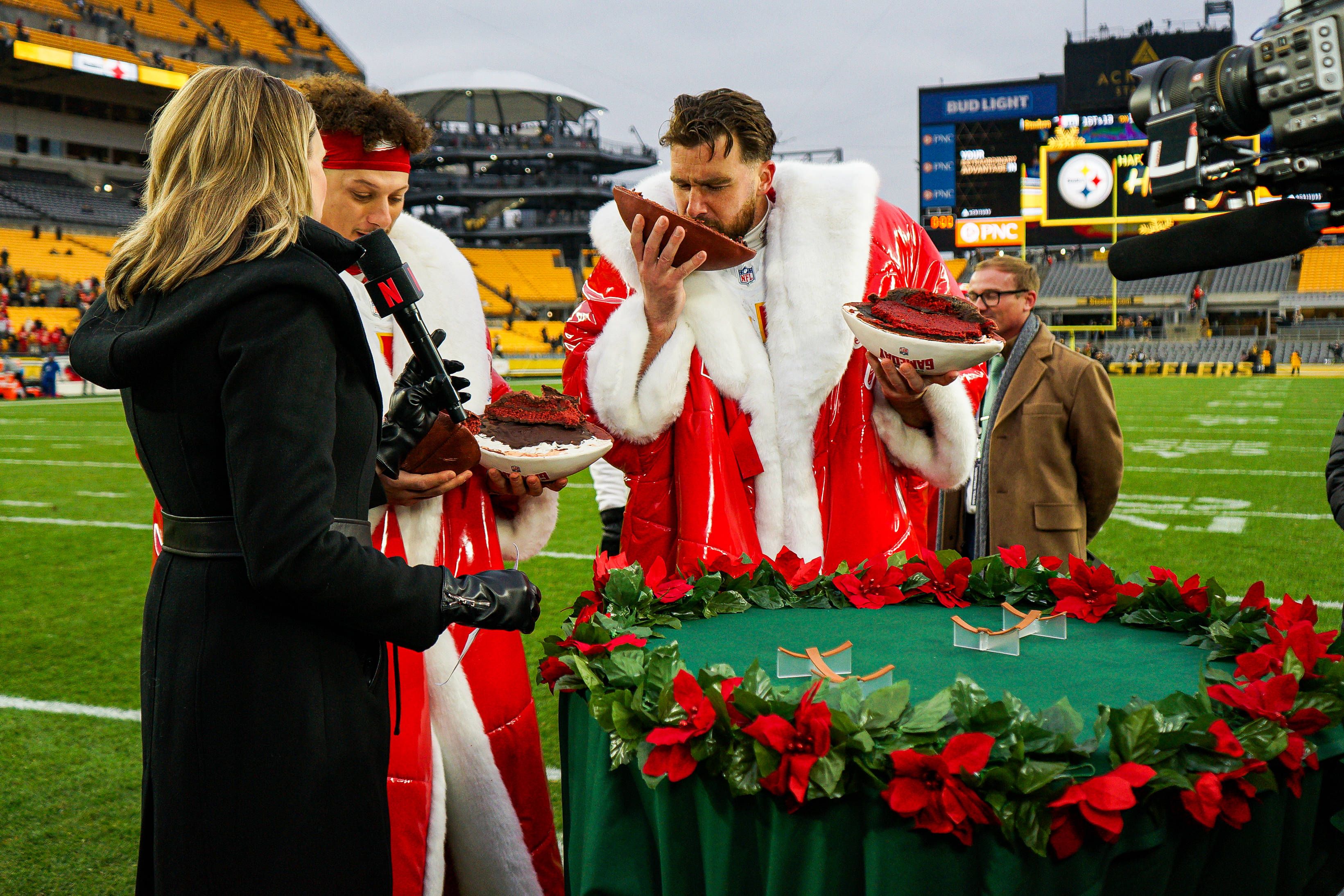 PITTSBURGH, PA - DECEMBER 25: Kansas City Chiefs tight end Travis Kelce (87) eats a football cake after the regular season NFL, American Football Herren, USA football game between the Kansas City C...