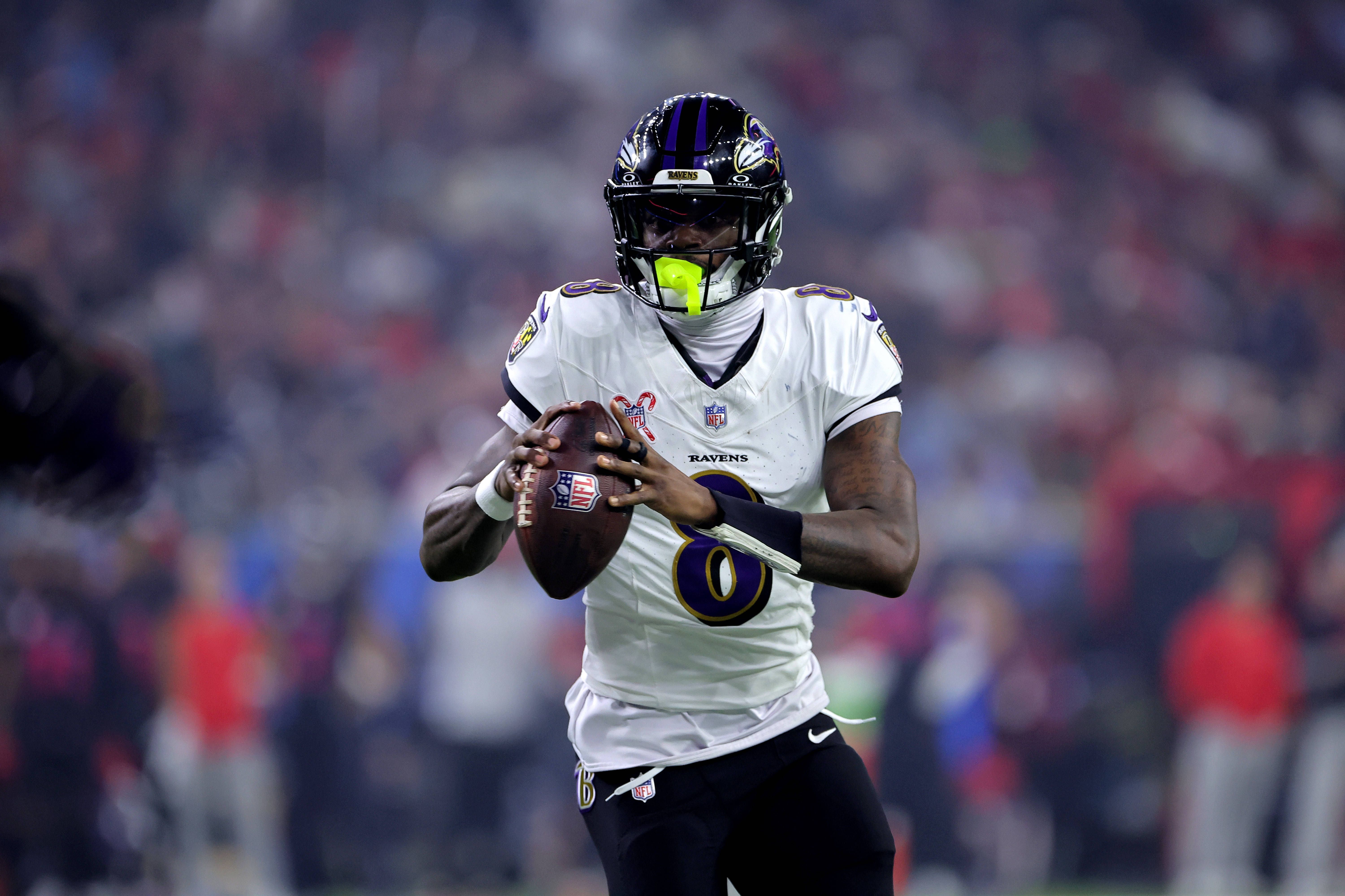 December 25, 2024, Houston, Texas, U.S: Baltimore Ravens quarterback Lamar Jackson (8) looks to pass downfield during the third quarter between the Houston Texans and the Baltimore Ravens at NRG St...