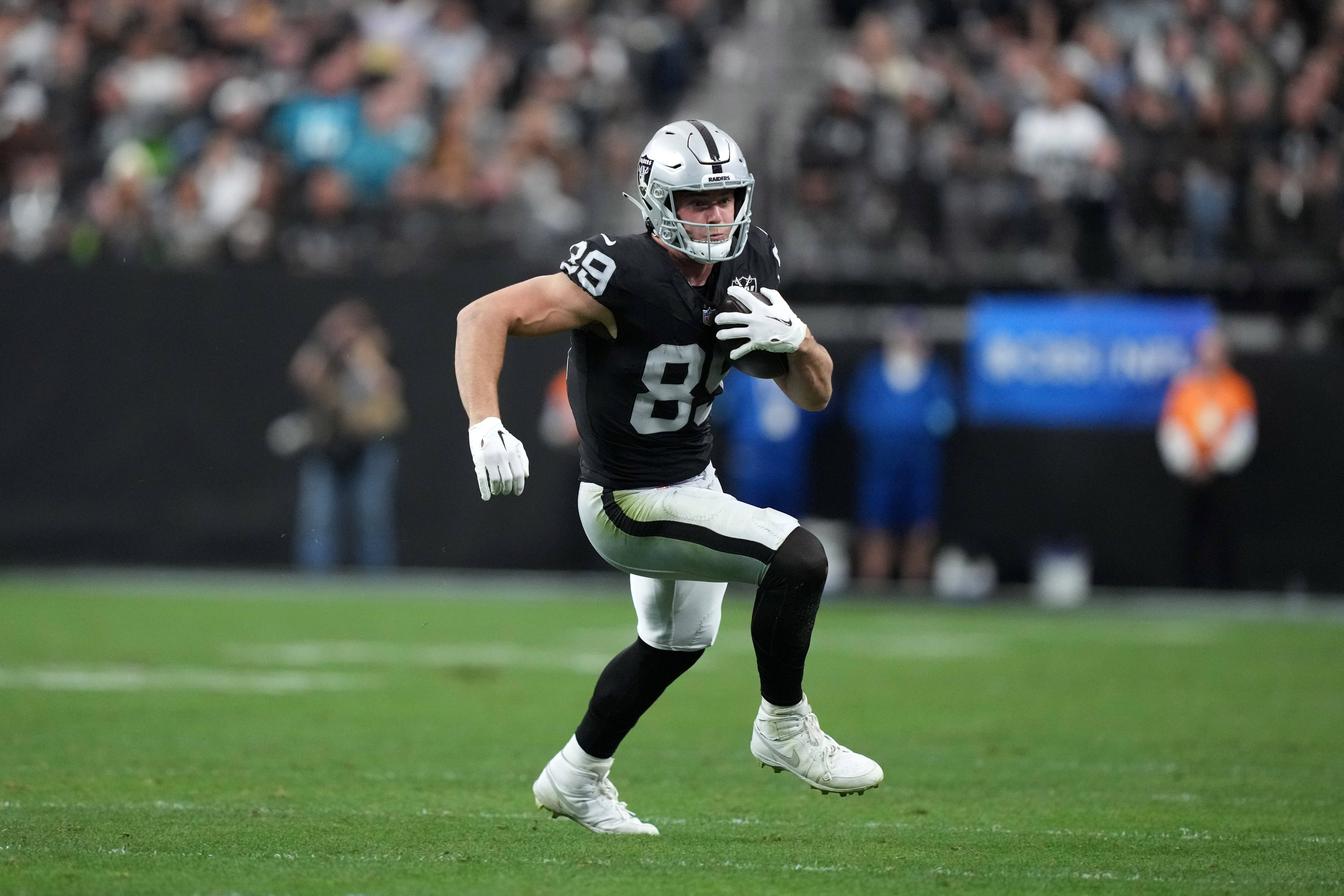NFL, American Football Herren, USA Jacksonville Jaguars at Las Vegas Raiders Dec 22, 2024; Paradise, Nevada, USA; Las Vegas Raiders tight end Brock Bowers (89) carries the ball against the Jacksonv...