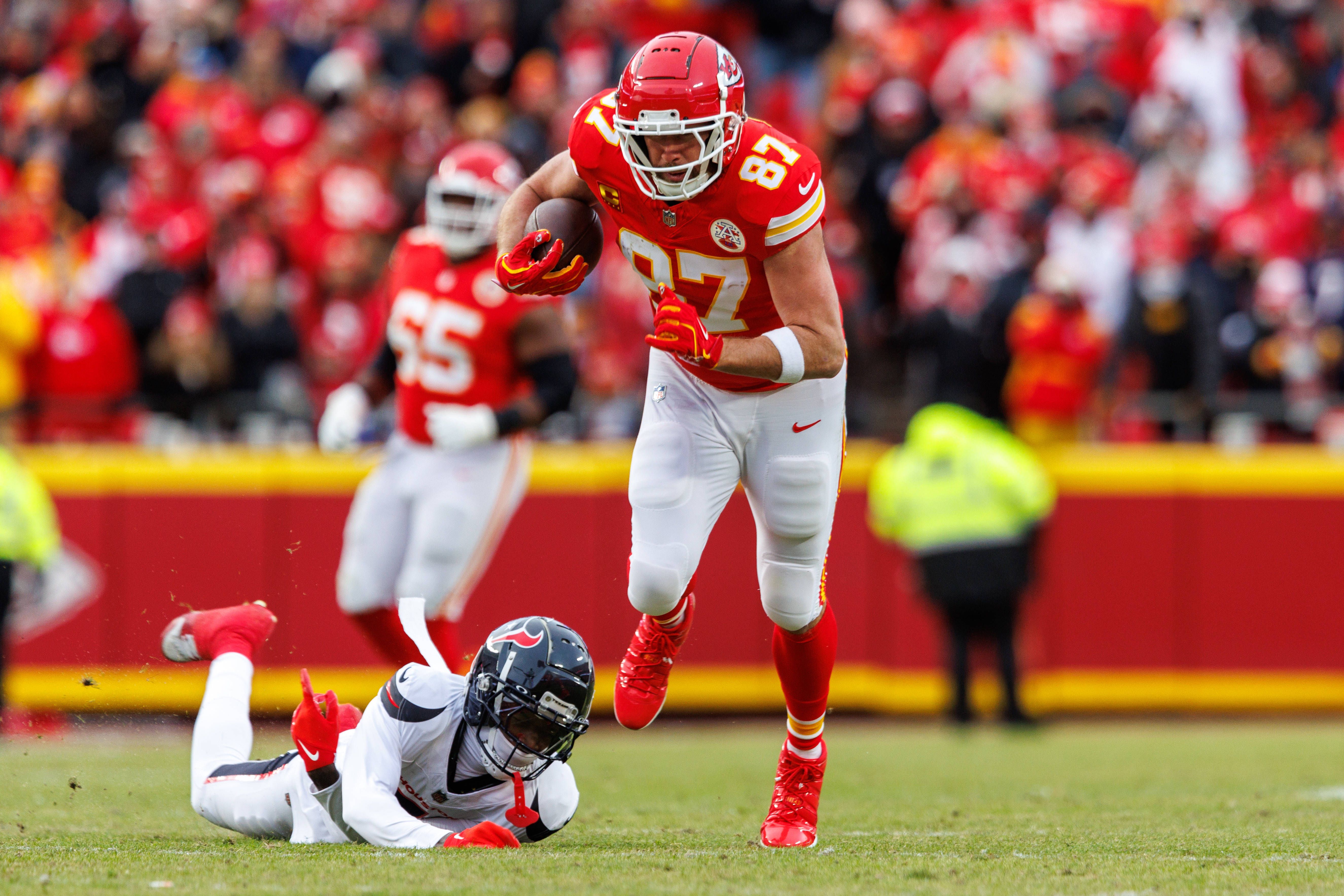 KANSAS CITY, MO - JANUARY 18: Kansas City Chiefs tight end Travis Kelce (87) runs the ball after a reception against the Houston Texans during the AFC Divisional Playoff game on January 18th, 2025 ...