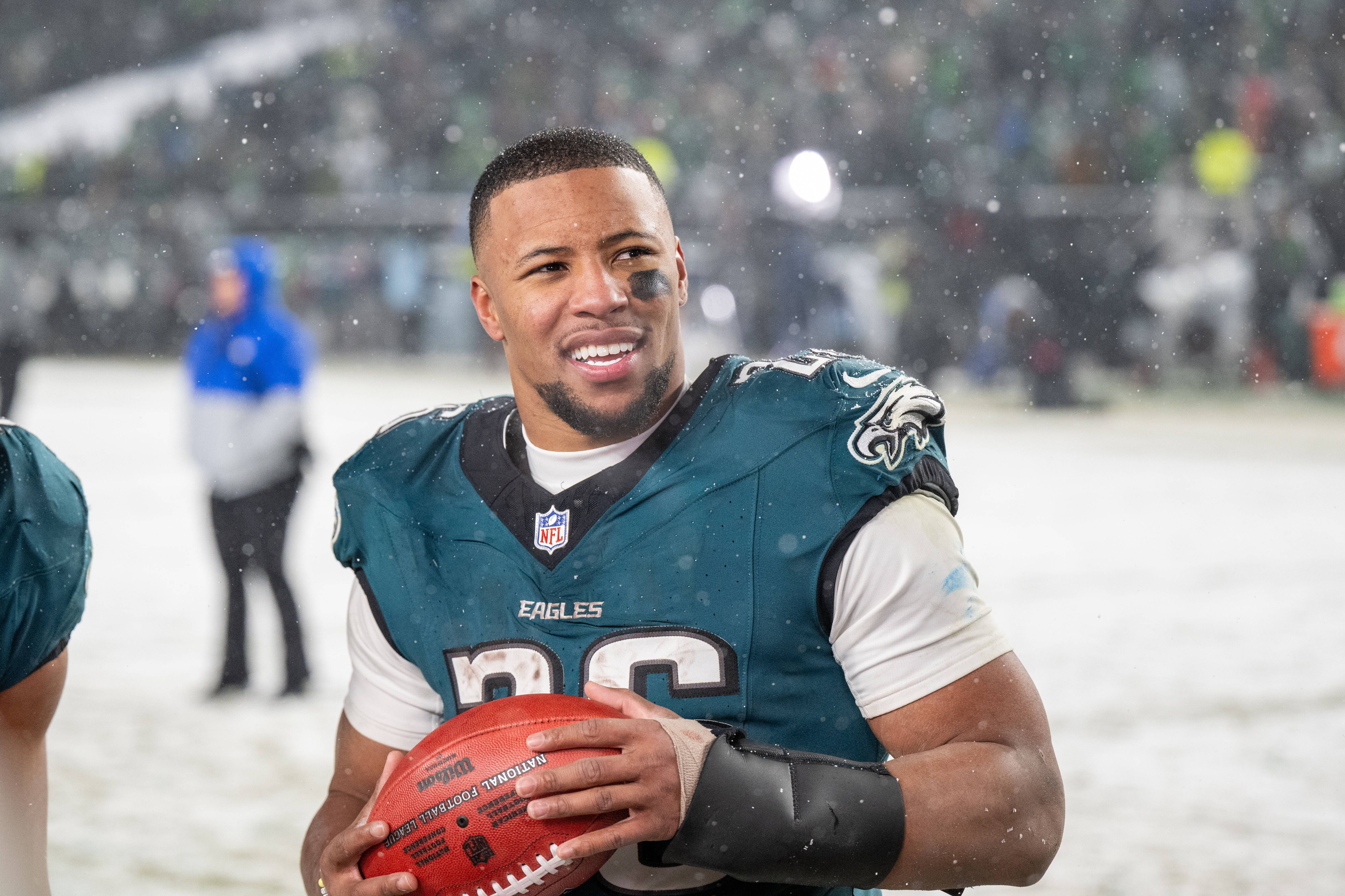 PHILADELPHIA, PA - JANUARY 19: Philadelphia Eagles running back Saquon Barkley (26) smiles after the NFC Divisional Playoff game between the Philadelphia Eagles and the Los Angeles Rams on January ...