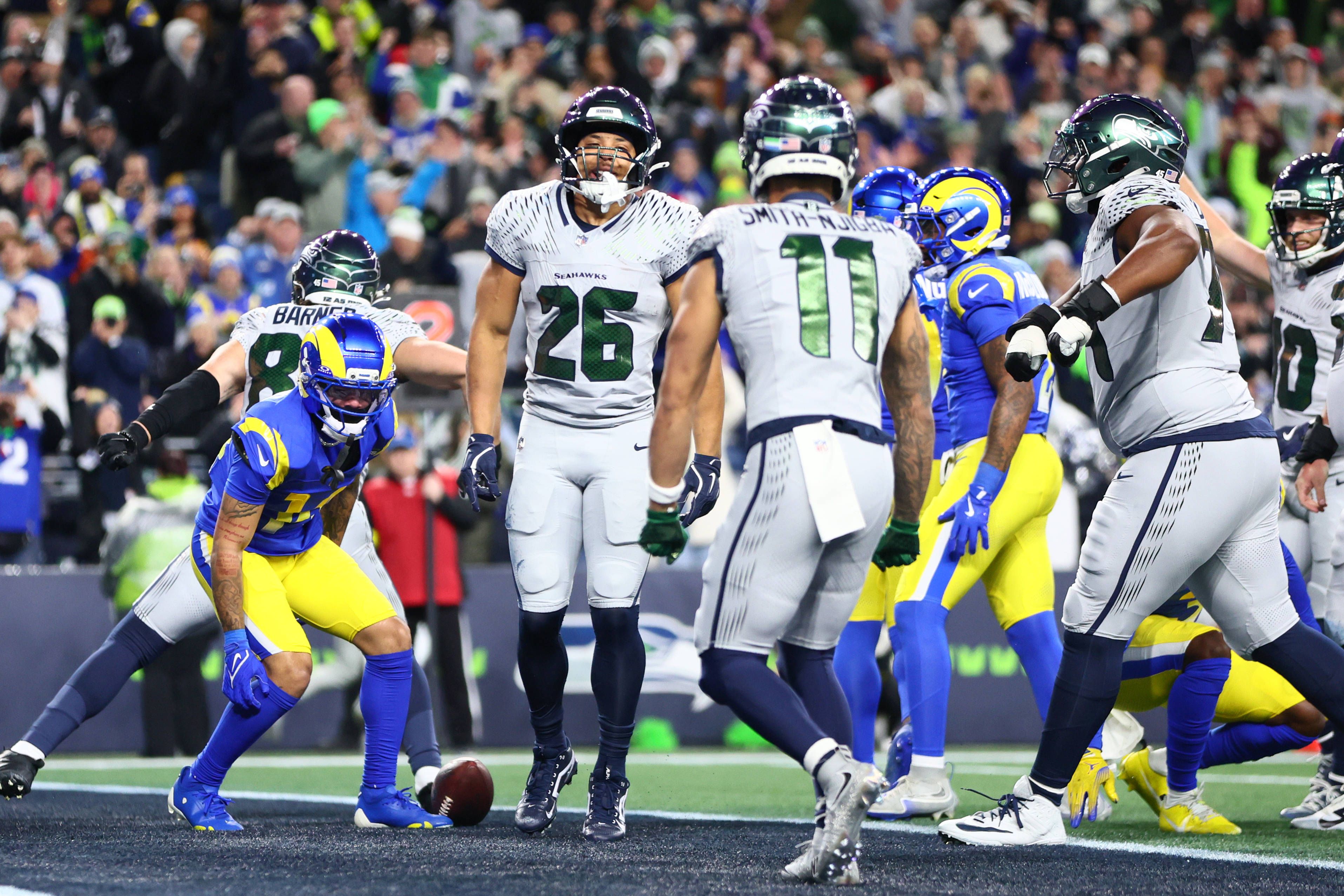 NFL, American Football Herren, USA Los Angeles Rams at Seattle Seahawks Dec 18, 2025; Seattle, Washington, USA; Seattle Seahawks running back Zach Charbonnet (26) celebrates after scoring a touchdo...