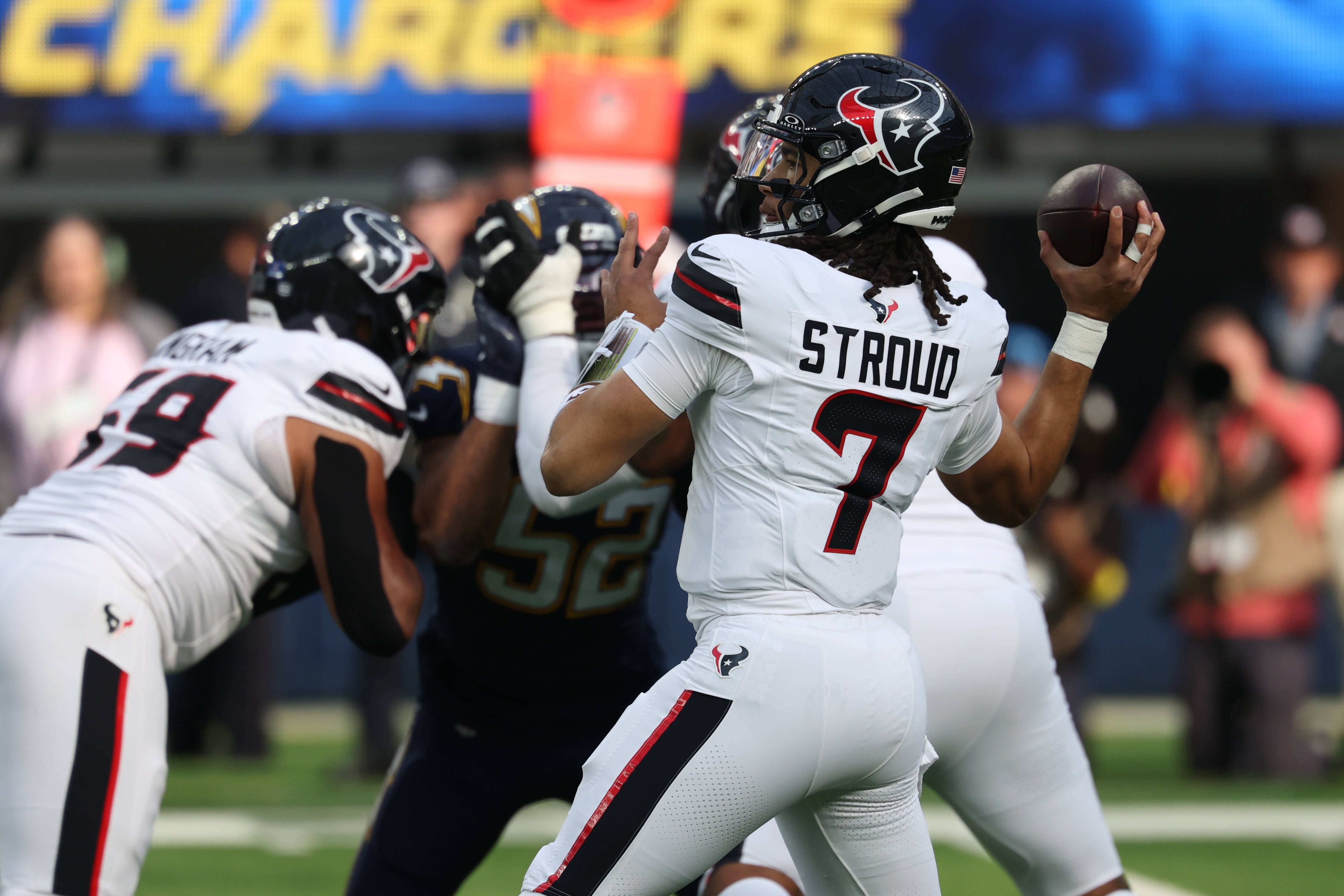 NFL, American Football Herren, USA Houston Texans at Los Angeles Chargers Dec 27, 2025; Inglewood, California, USA; Houston Texans quarterback C.J. Stroud (7) stands in the pocket against the Los A...