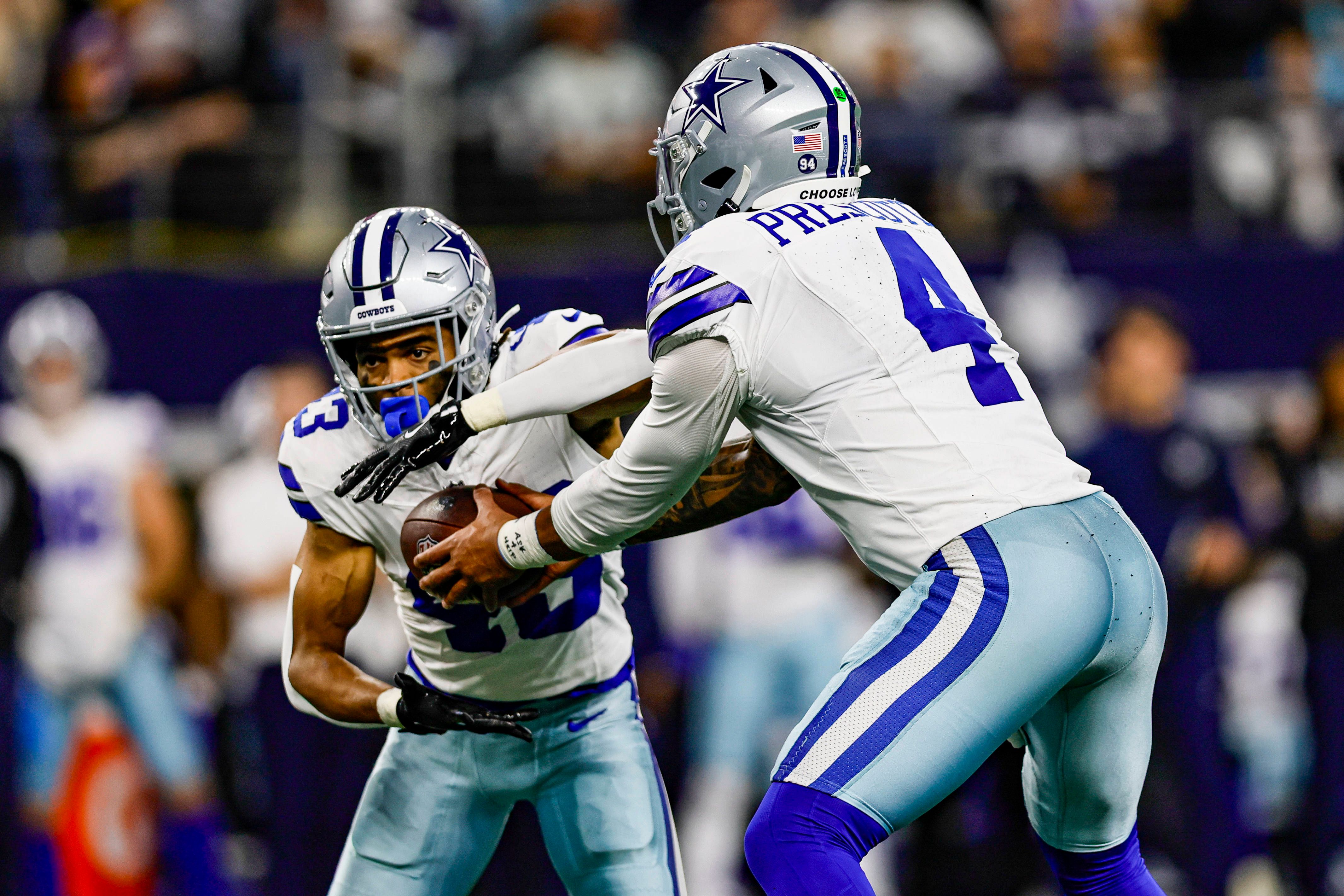ARLINGTON, TX - DECEMBER 14: Dallas Cowboys quarterback Dak Prescott (4) hands-off the football to running back Malik Davis (43) during the game between the Dallas Cowboys and the Minnesota Vikings...