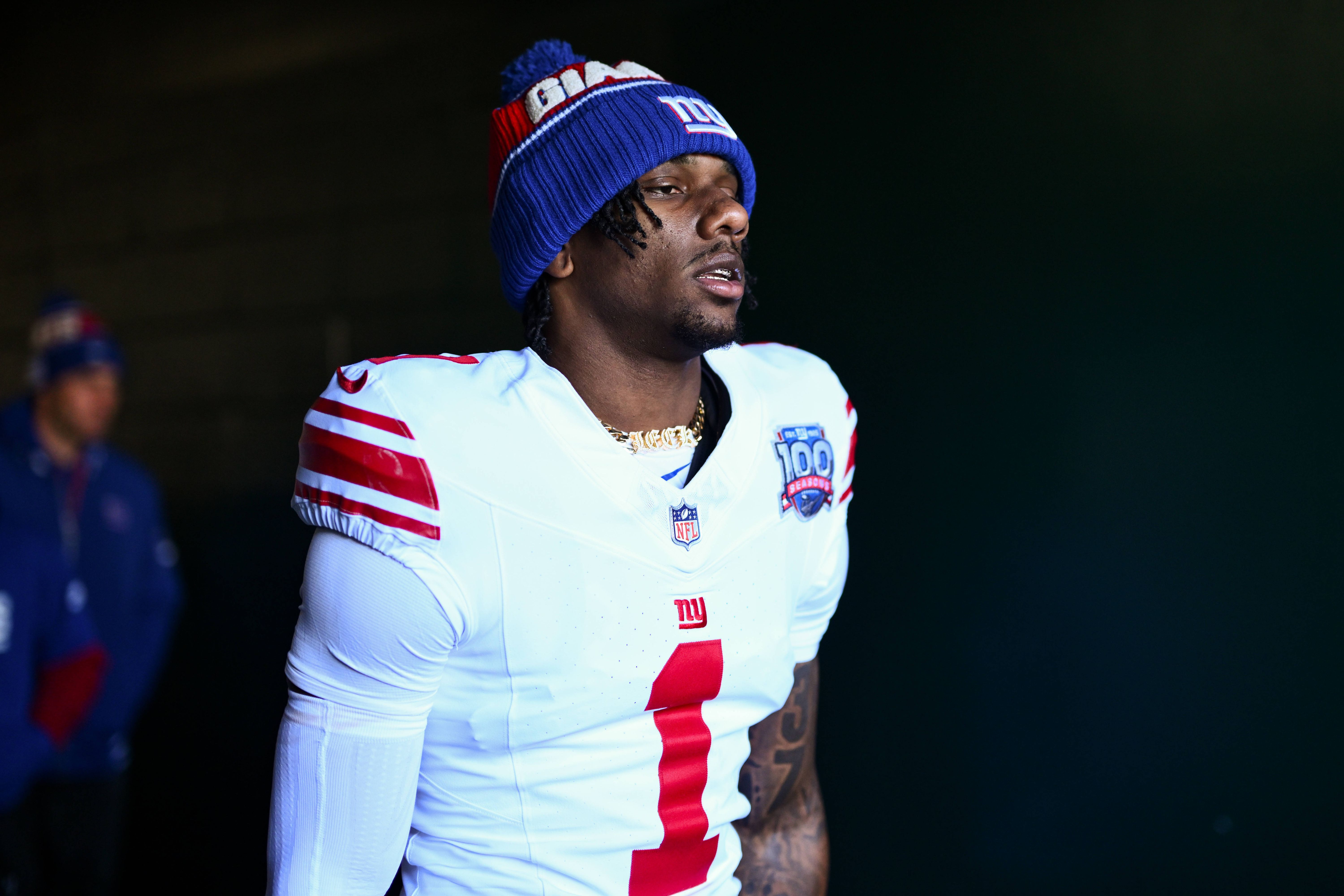 PHILADELPHIA, PA - JANUARY 05: New York Giants wide receiver Malik Nabers (1) enters the field before the game between the New York Giants and Philadelphia Eagles on January 05, 2025 at Lincoln Fin...
