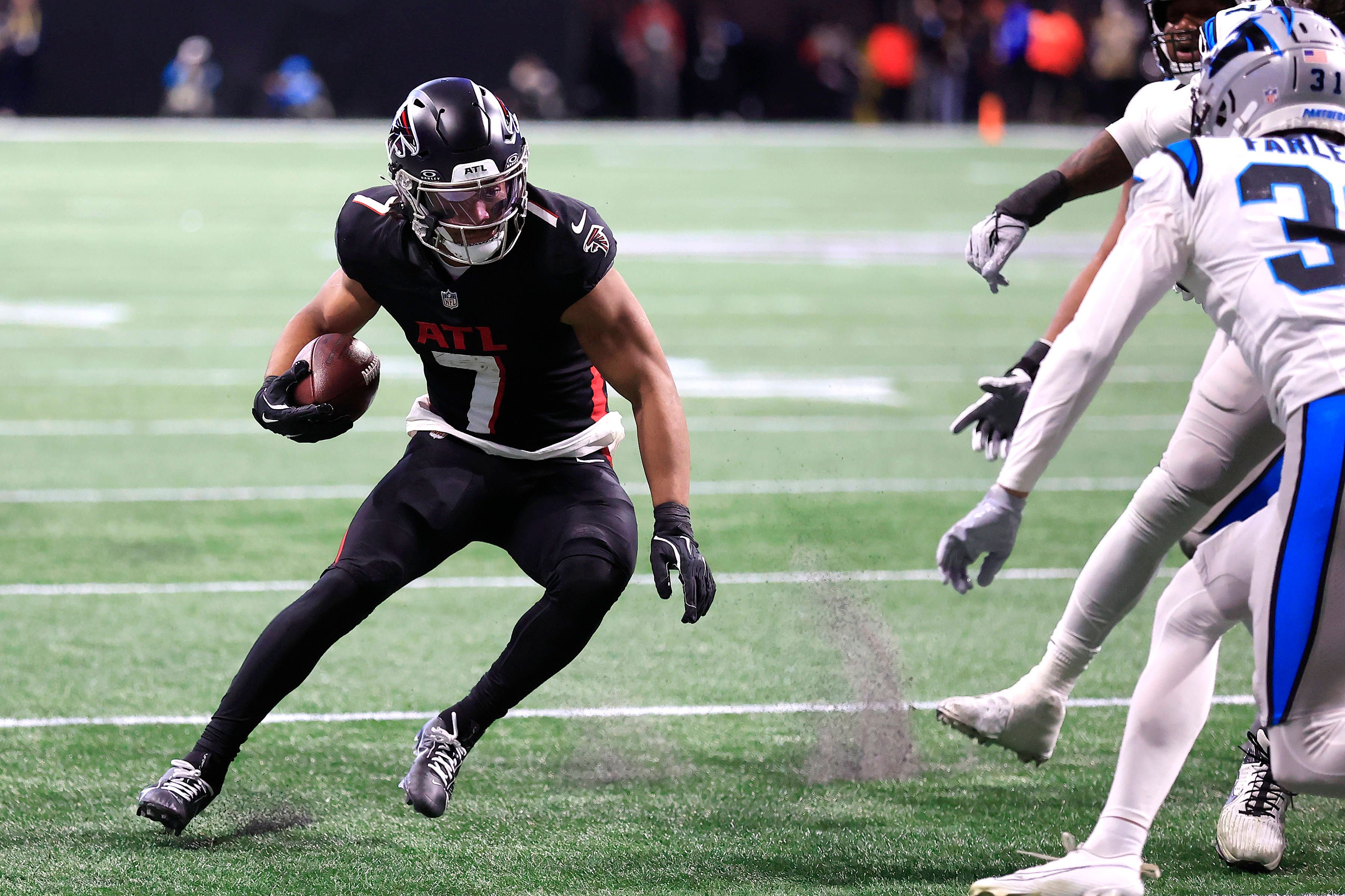 ATLANTA, GA - JANUARY 05: Atlanta Falcons running back Bijan Robinson 7 carries the ball during the final regular-season game between the Atlanta Falcons and the Carolina Panthers on January 5, 202...