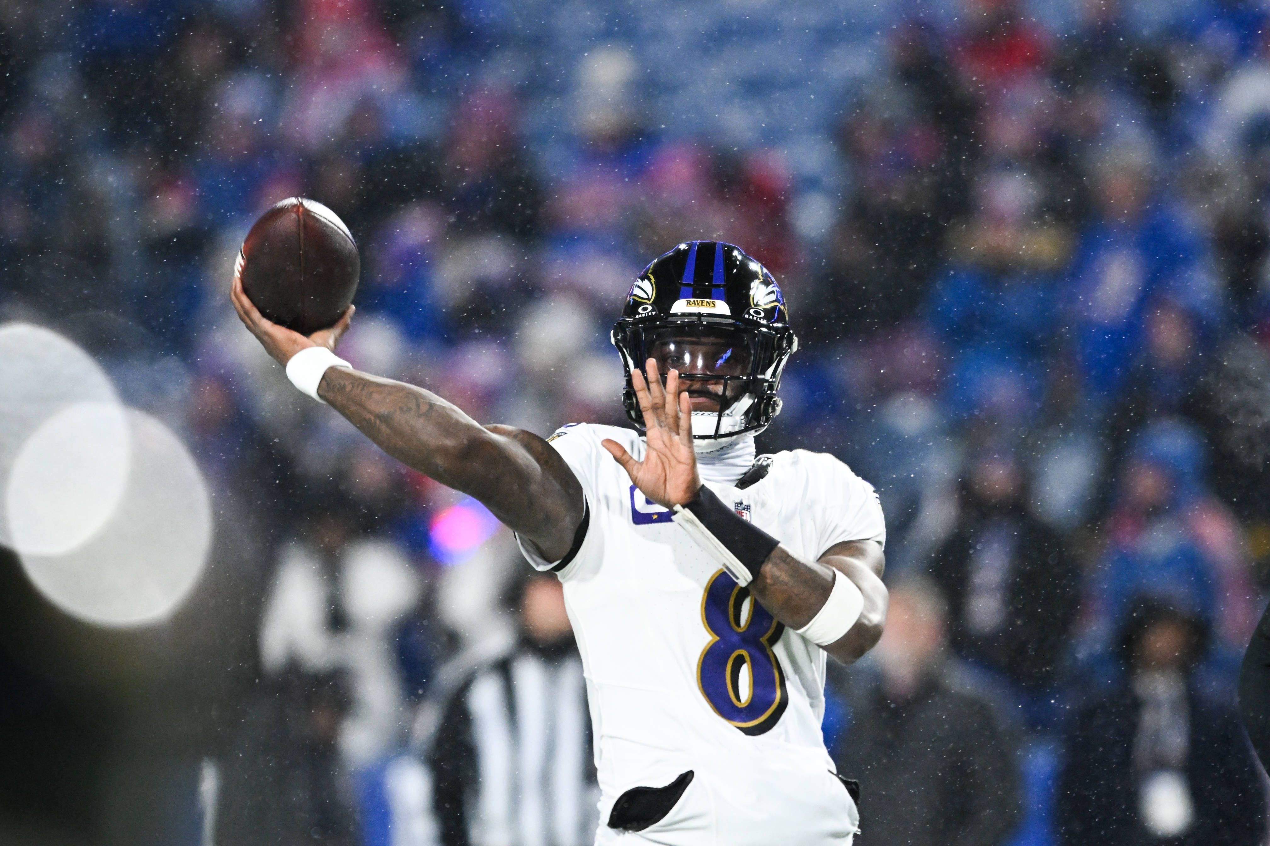 NFL, American Football Herren, USA AFC Divisional Round- Baltimore Ravens at Buffalo Bills Jan 19, 2025; Orchard Park, New York, USA; Baltimore Ravens quarterback Lamar Jackson (8) throws the ball ...