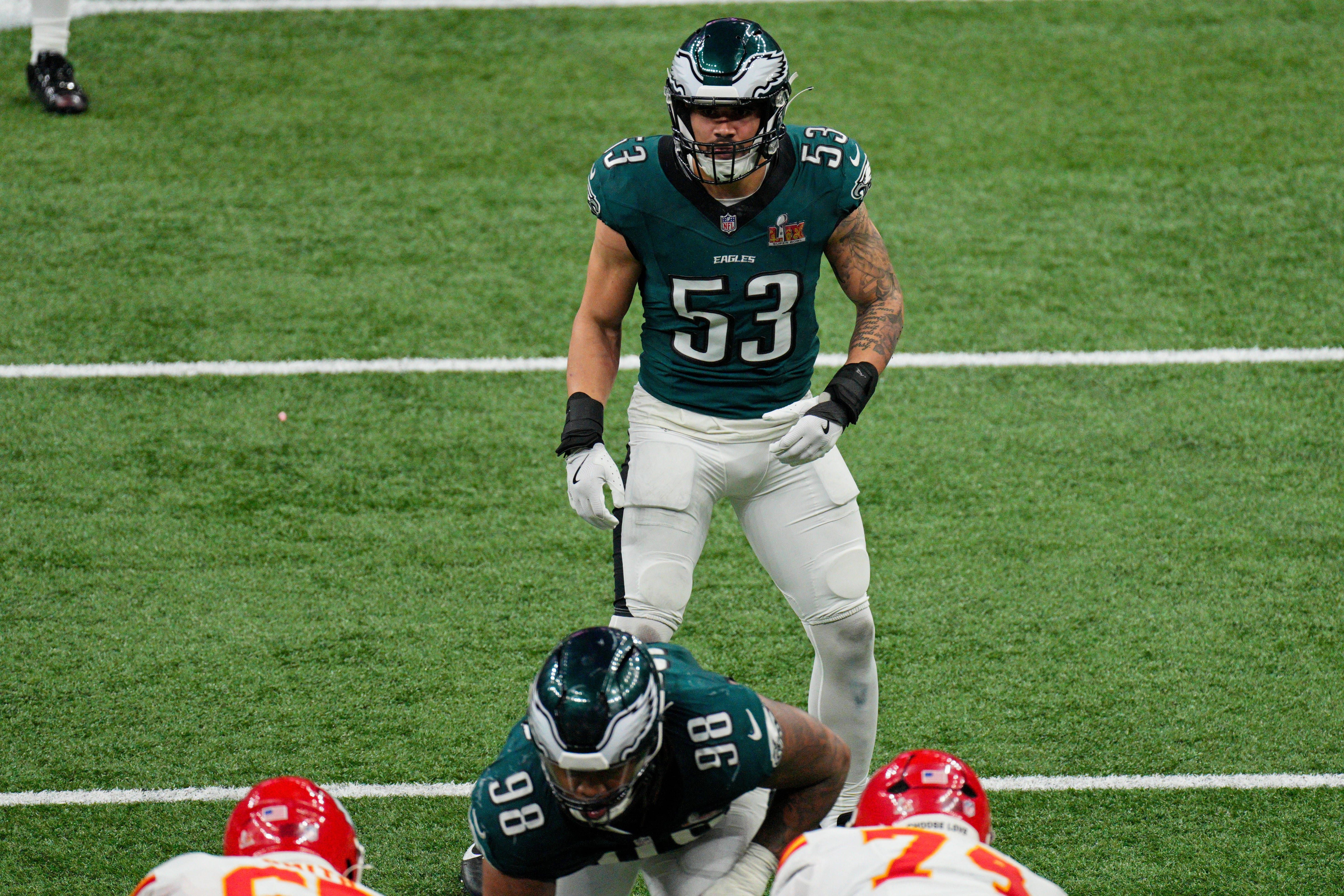 NEW ORLEANS, LA - FEBRUARY 09: Philadelphia Eagles linebacker Zack Baun (53) waits for the snap during Super Bowl LIX between the Philadelphia Eagles and the Kansas City Chiefs on February 9, 2025 ...