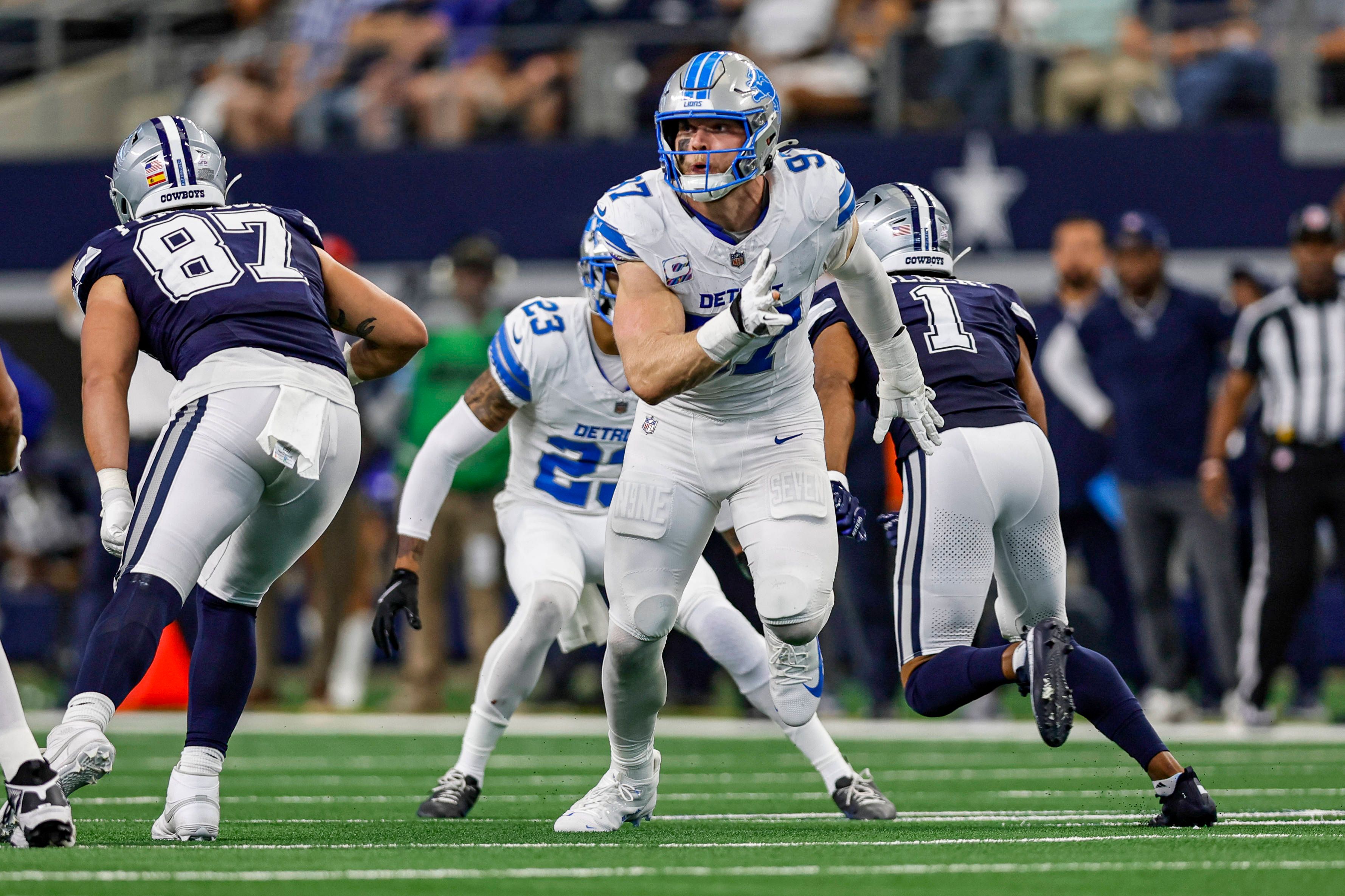 ARLINGTON, TX - OCTOBER 13: Detroit Lions defensive end Aidan Hutchinson (97) rushes the passer during the game between the Dallas Cowboys and the Detroit Lions on October 13, 2024 at AT&T Stadium ...