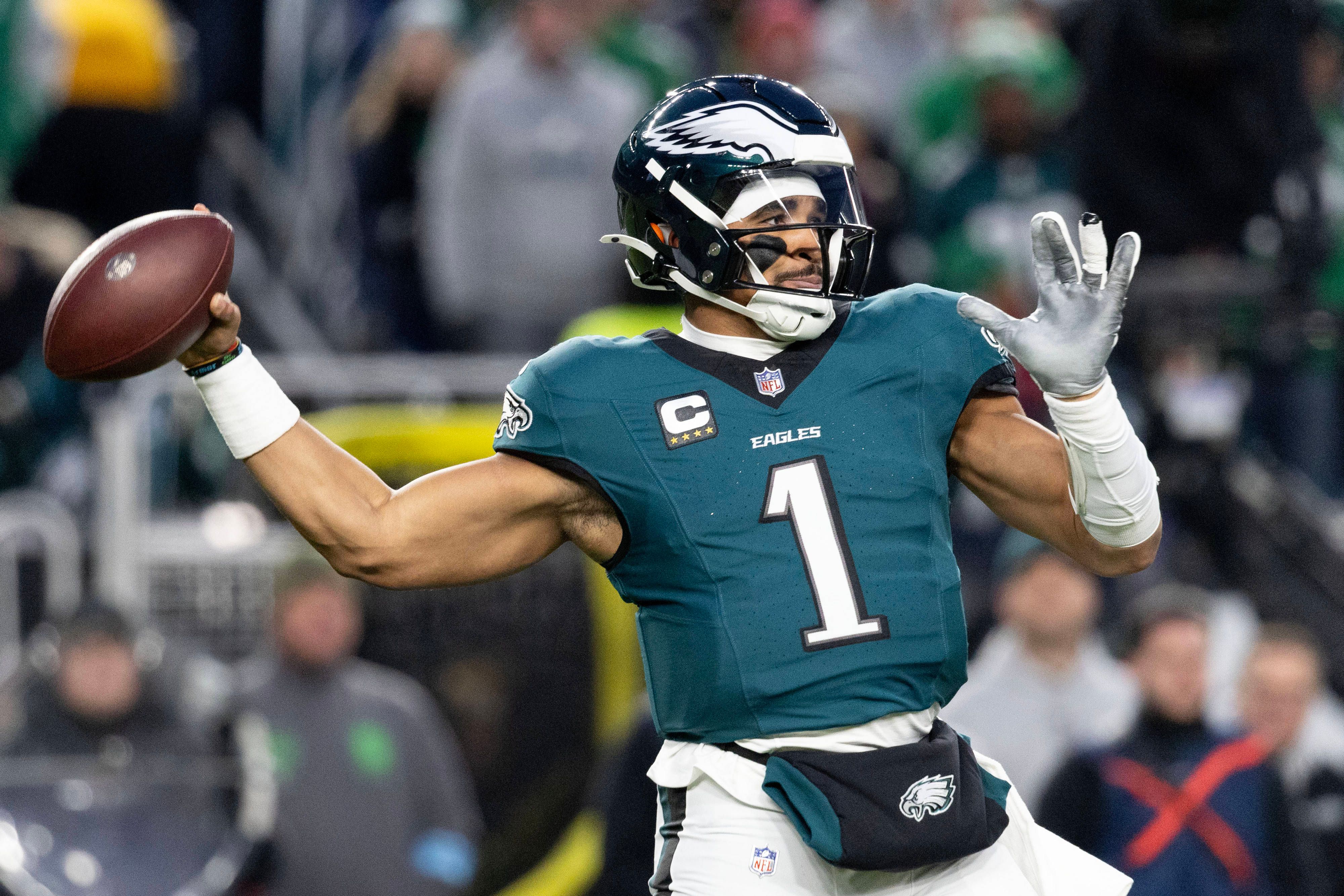 Philadelphia Eagles quarterback Jalen Hurts (1) throws during the first half of NFL, American Football Herren, USA action against the Pittsburgh Steelers at Lincoln Financial Field in Philadelphia ...