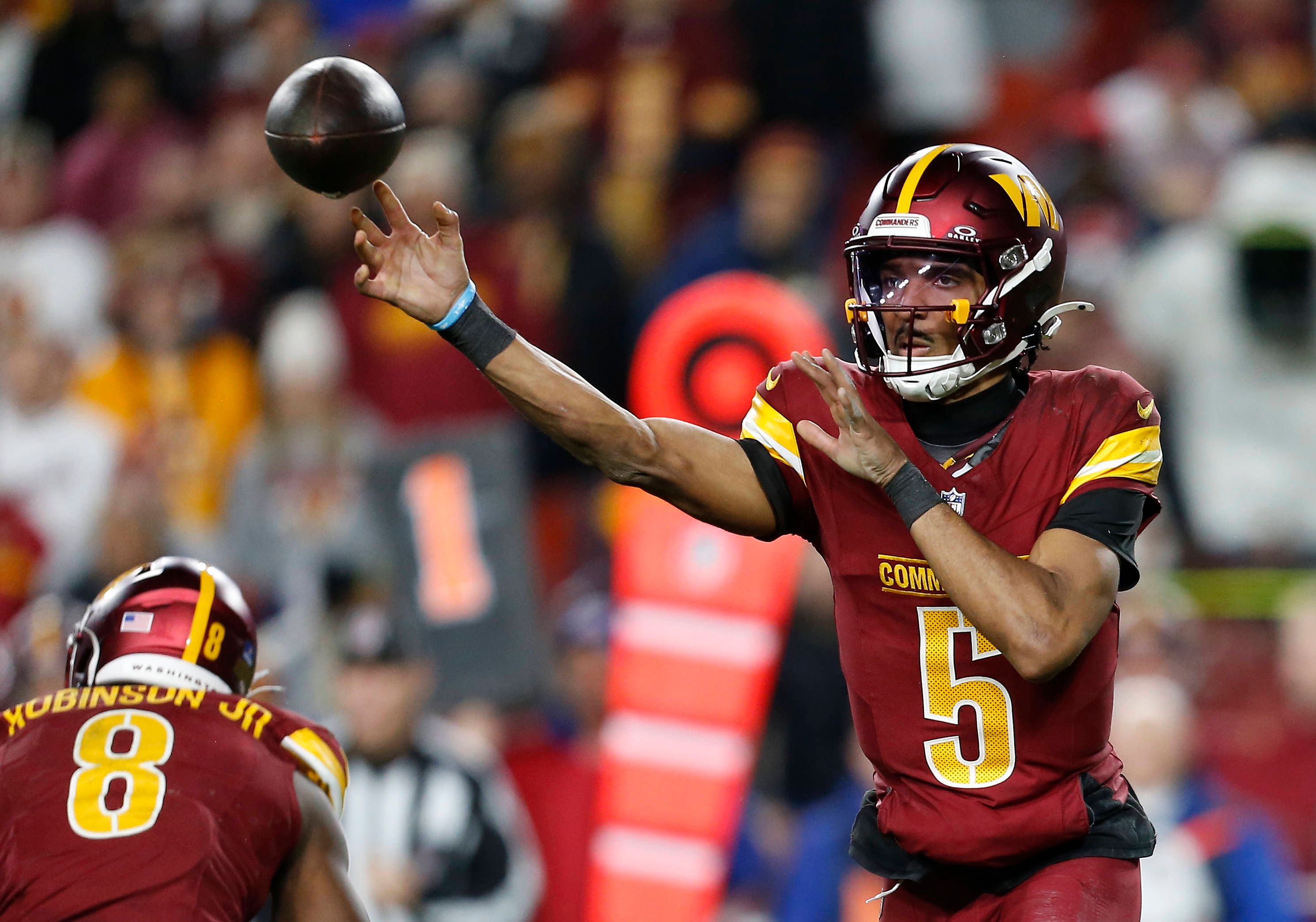 LANDOVER, MD - DECEMBER 29: Washington Commanders quarterback Jayden Daniels (5) throws a pass from the pocket during the Atlanta Falcons game versus the Washington Commanders at Northwest Stadium ...