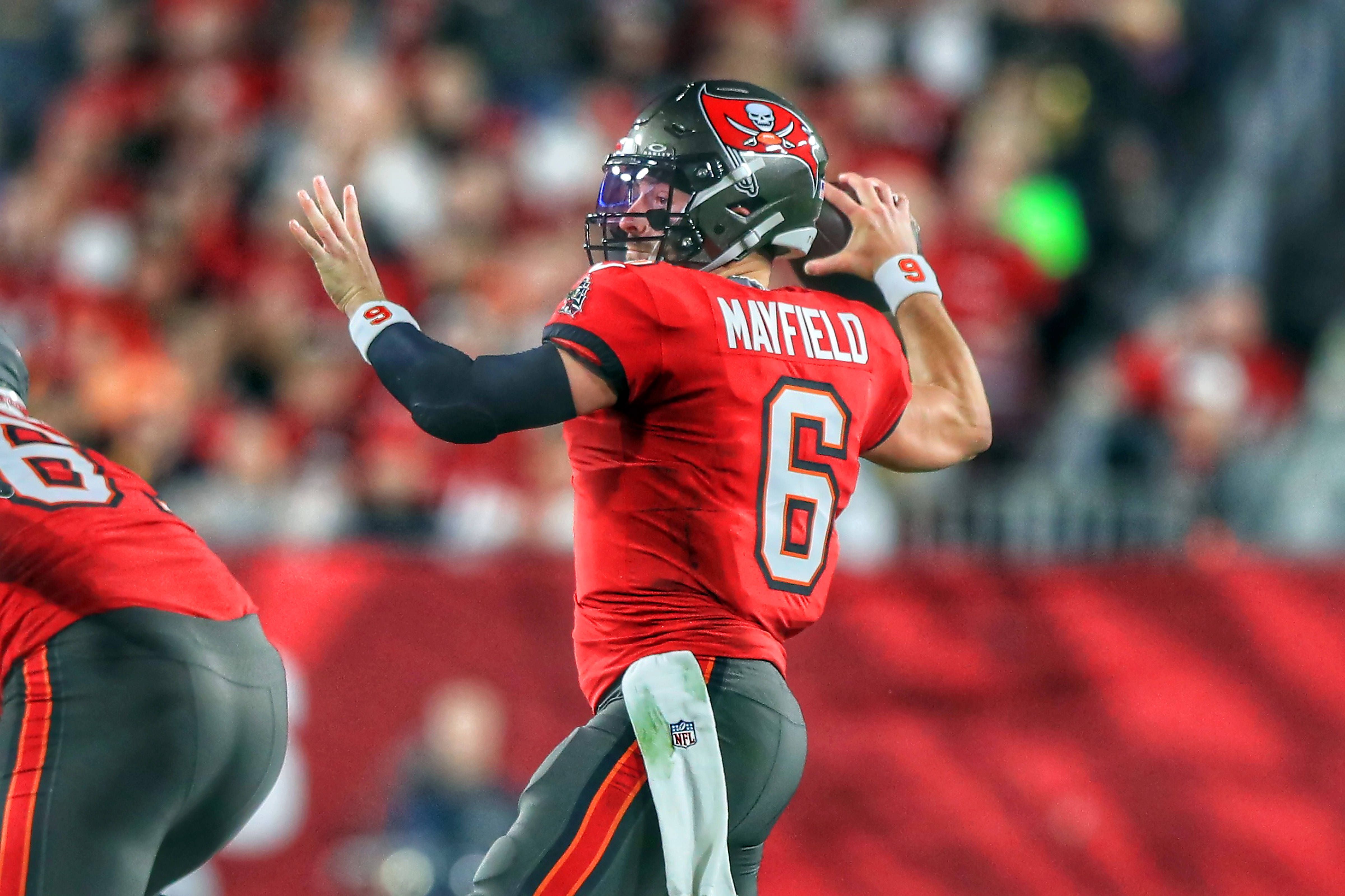 TAMPA, FL - JANUARY 12: Tampa Bay Buccaneers Quarterback Baker Mayfield (6) throws a pass during the NFC Wild Card Playoff game between the Washington Commanders and the Tampa Bay Buccaneers on Jan...