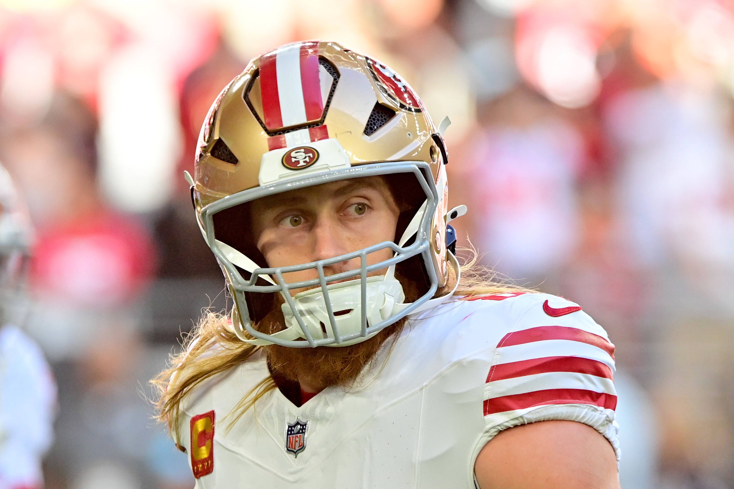 NFL, American Football Herren, USA San Francisco 49ers at Arizona Cardinals Jan 5, 2025; Glendale, Arizona, USA; San Francisco 49ers tight end George Kittle (85) looks on prior to the game against ...