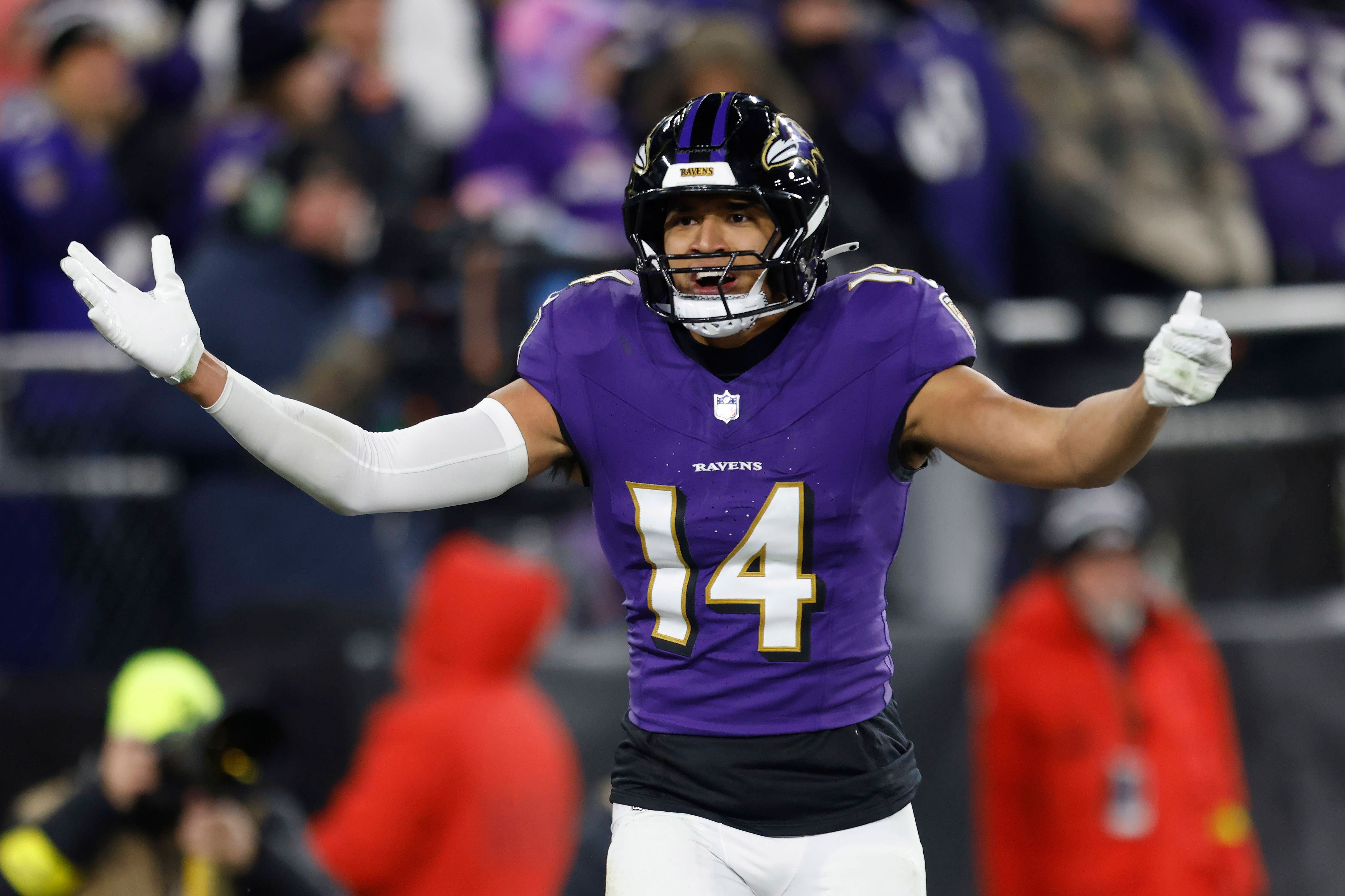 January 11, 2025: Baltimore Ravens safety Kyle Hamilton (14) reacts to an official during a wildcard game against the Pittsburgh Steelers at M&T Bank Stadium in Baltimore, MD. Photo Mike Buscher Ca...