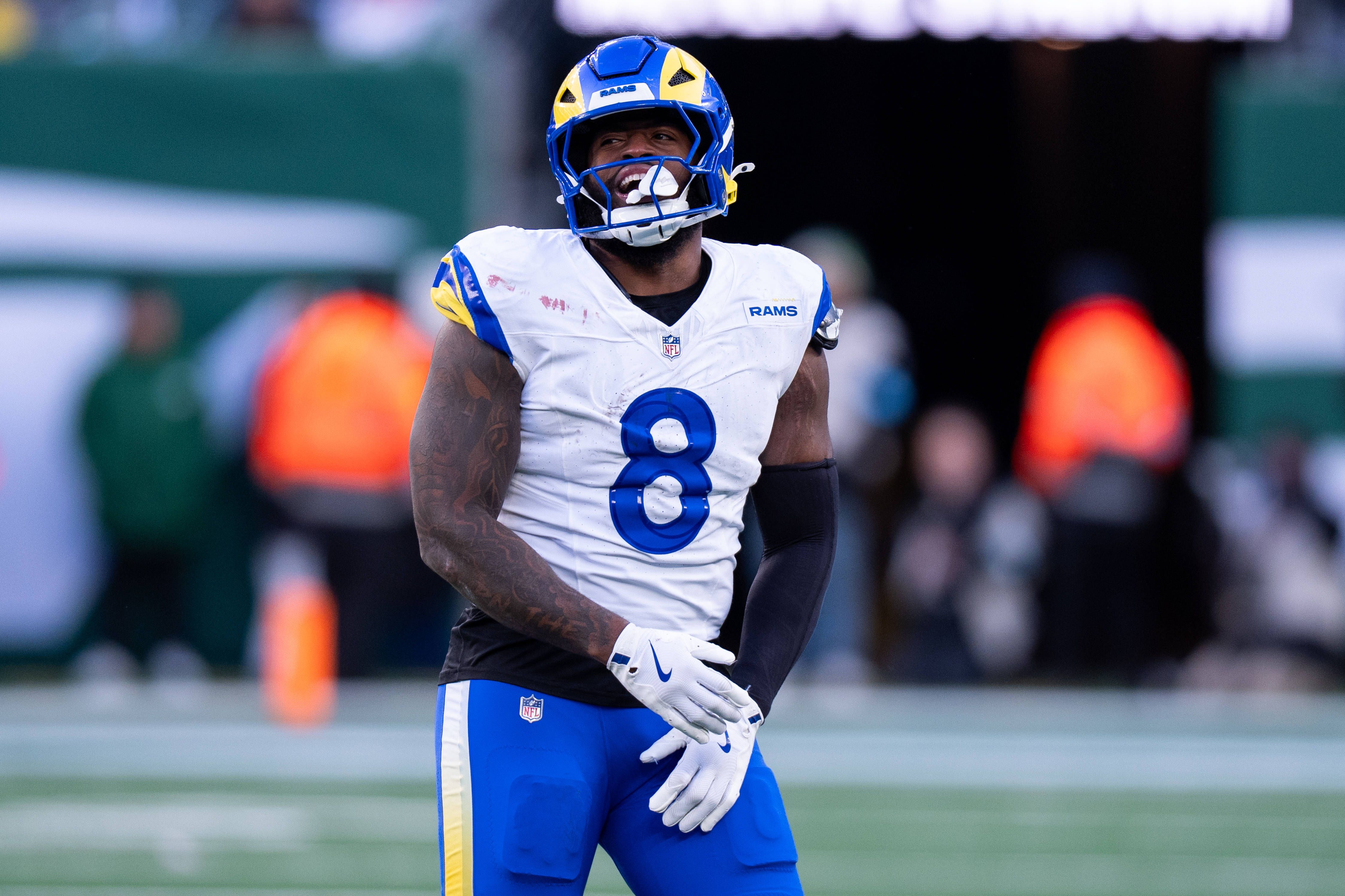 Los Angeles Rams linebacker Jared Verse (8) reacts during the NFL, American Football Herren, USA football game against the New York Jets, Sunday, Dec. 22, 2024, in East Rutherford. ( Cal Media) Eas...