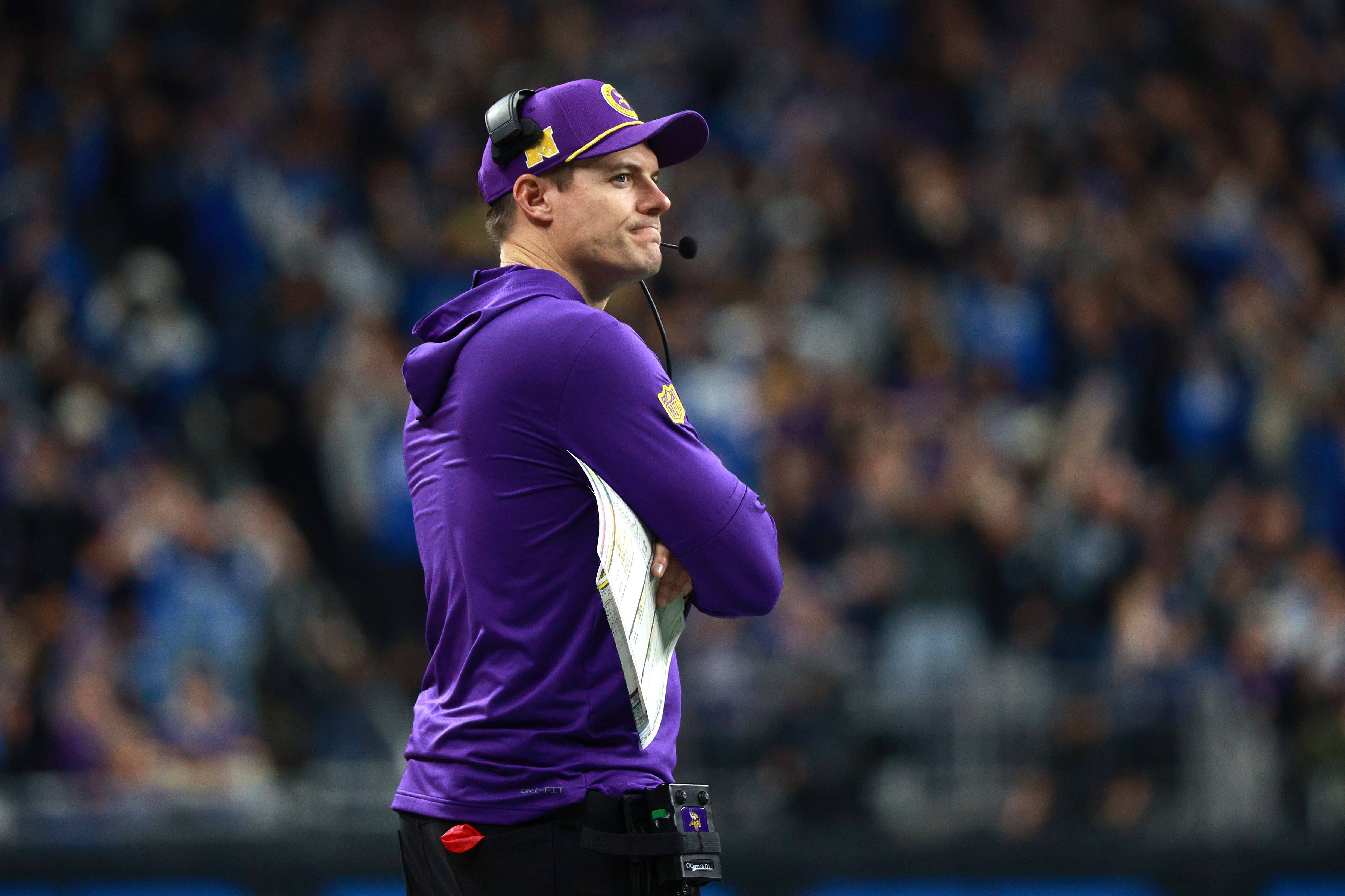 Minnesota Vikings vs Detroit Lions DETROIT,MICHIGAN-January 5: Minnesota Vikings head coach Kevin O Connell reacts after place kicker Will Reichard 16 misses the kick during the second half of an N...