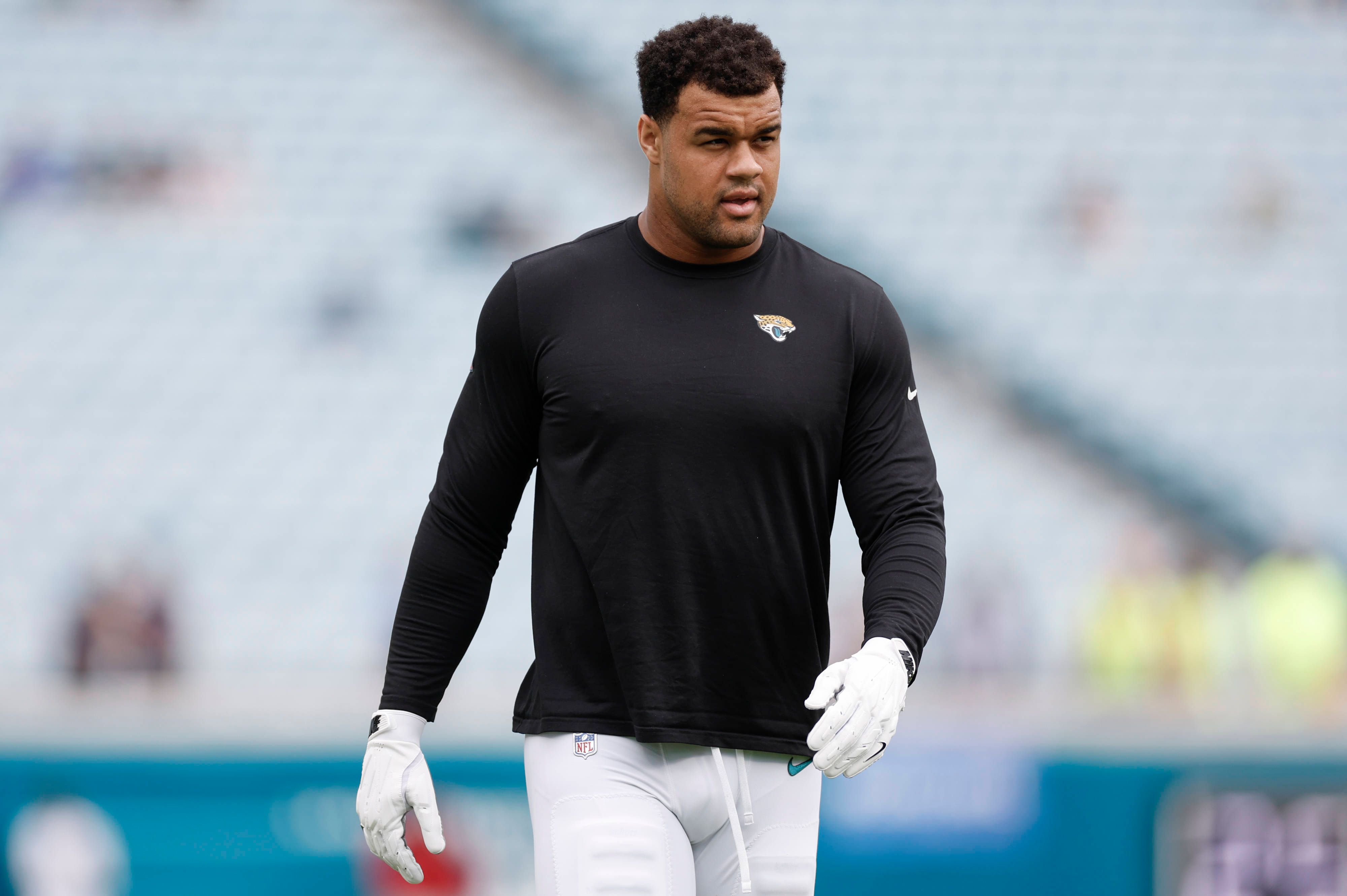 JACKSONVILLE, FL - DECEMBER 29: Jacksonville Jaguars defensive end Arik Armstead (91) warms up before the game between the Jacksonville Jaguars and the Tennessee Titans on December 29, 2024 at Ever...