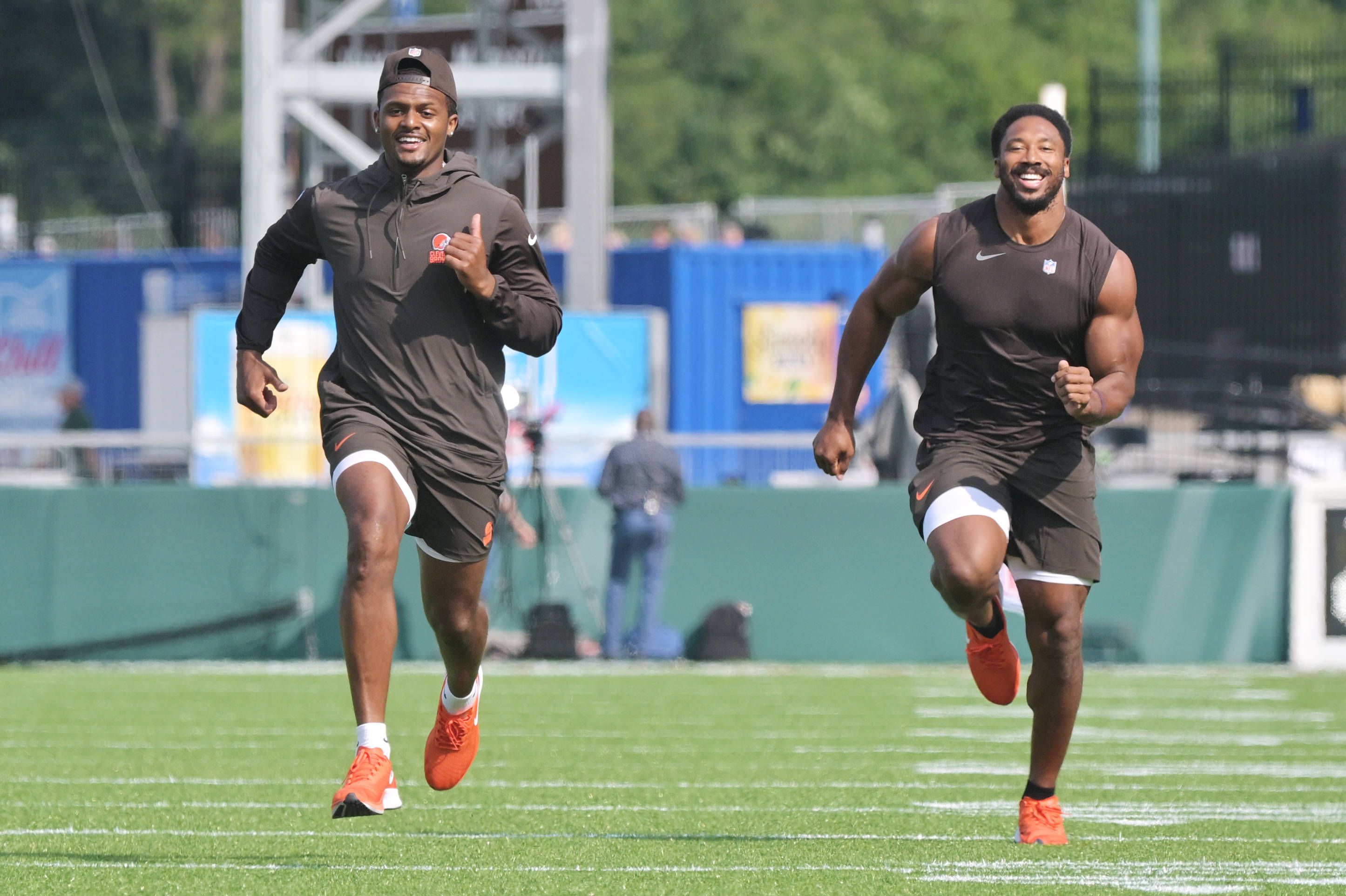 NFL, American Football Herren, USA Pro Football Hall of Fame-New York Jets at Cleveland Browns Aug 3, 2023; Canton, Ohio, USA; Cleveland Browns quarterback Deshaun Watson, left, and defensive end M...
