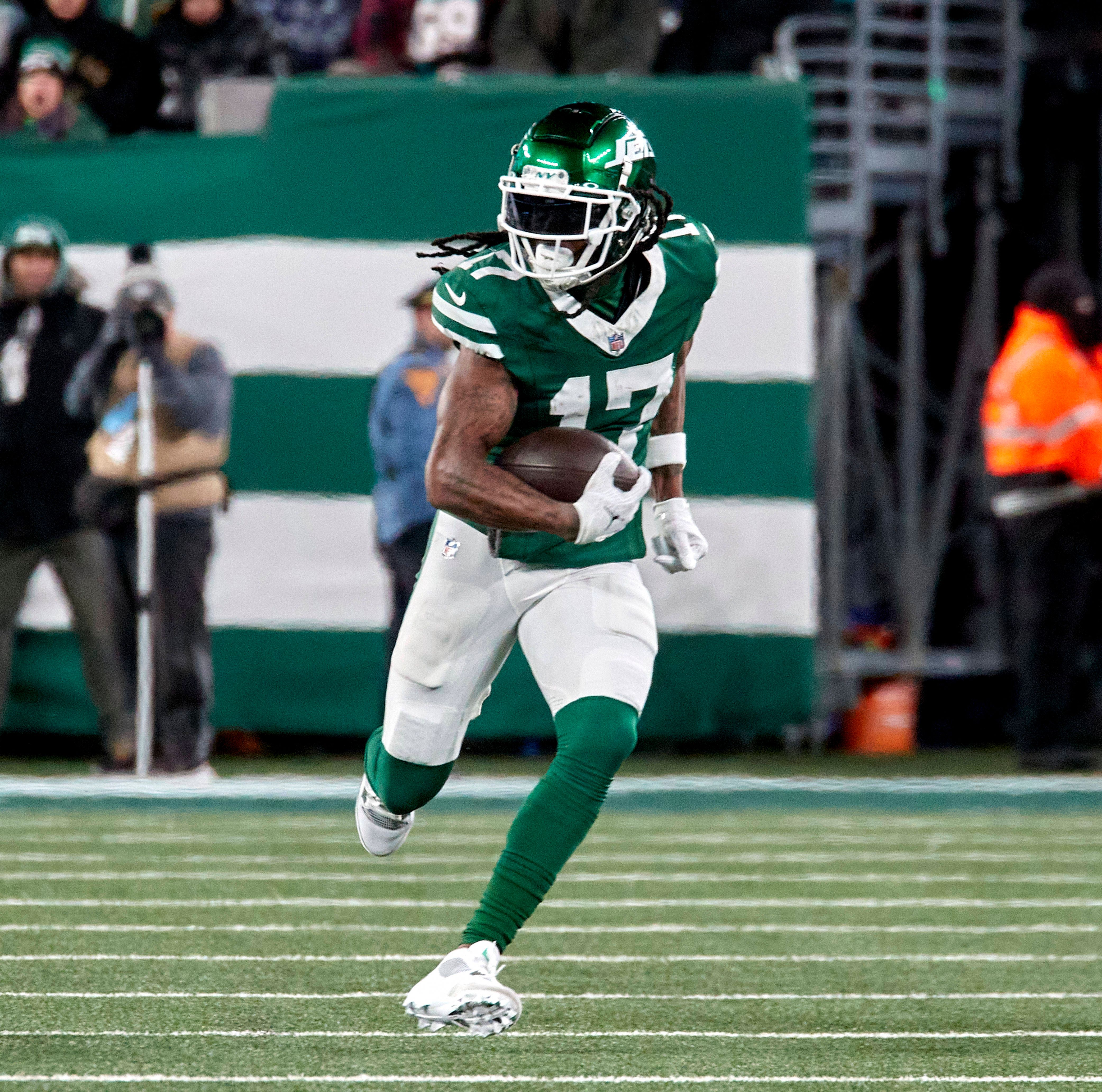 NFL, American Football Herren, USA 2025: Dolphins vs Jets JAN 05 New York Jets wide receiver Davante Adams (17) on a catch and run up field against the Miami Dolphins during a NFL game at MetLife S...