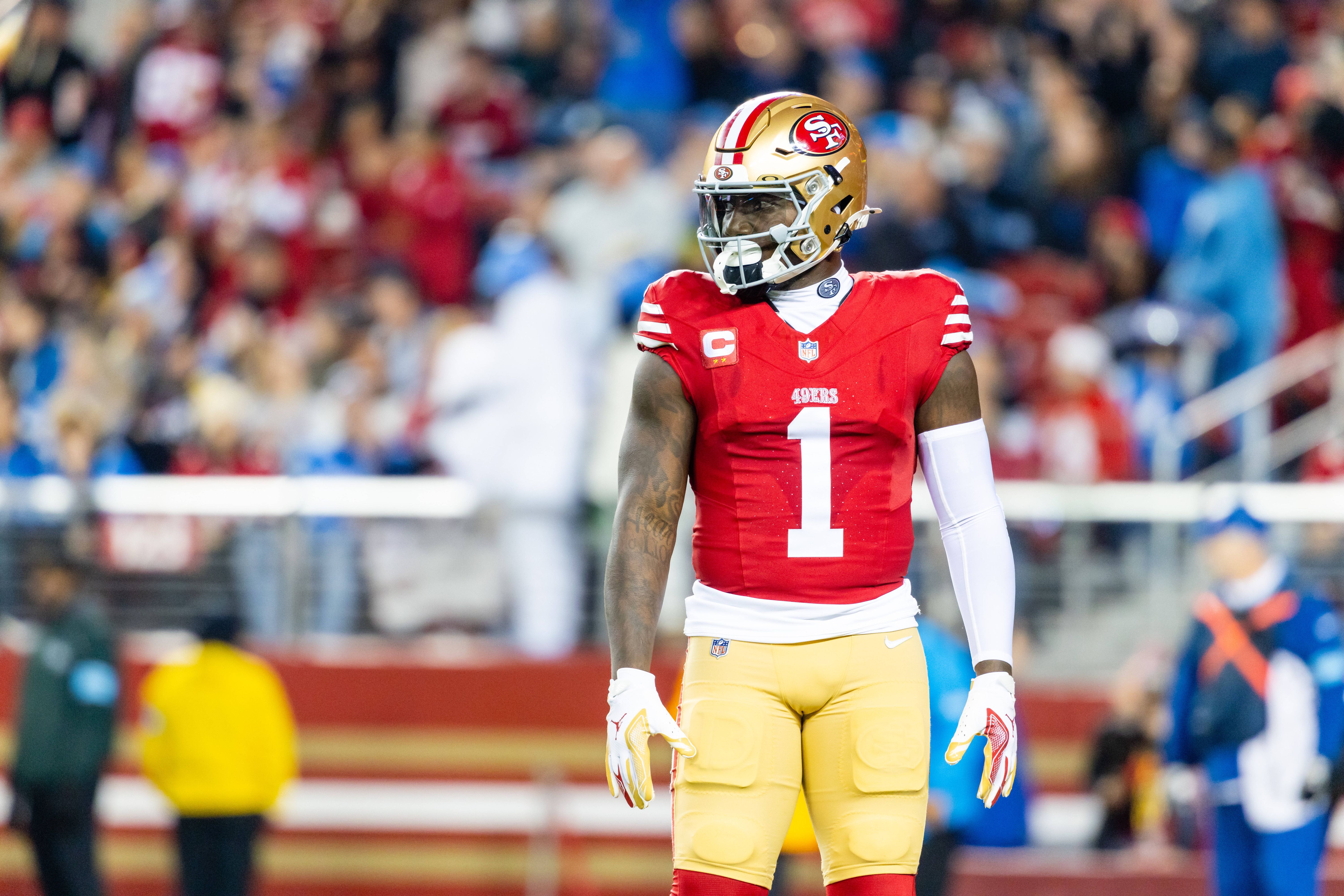 NFL, American Football Herren, USA Detroit Lions at San Francisco 49ers Dec 30, 2024; Santa Clara, California, USA; San Francisco 49ers wide receiver Deebo Samuel Sr. (1) celebrates after a play du...