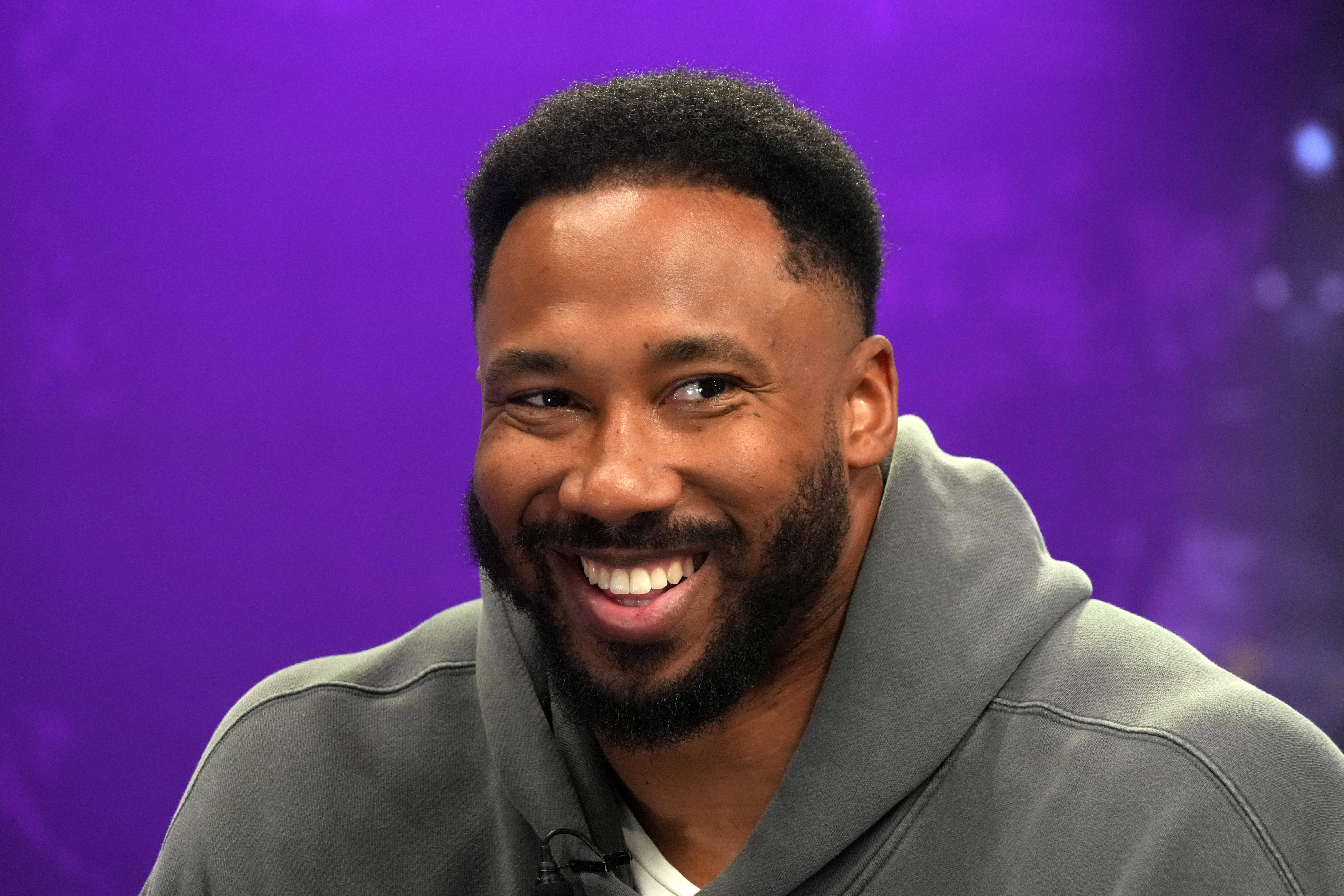 NFL, American Football Herren, USA Super Bowl LIX-City Scenes Feb 5, 2025; New Orleans, LA, USA; Cleveland Browns defensive end Myles Garrett on radio row at the Super Bowl LIX media center at the ...