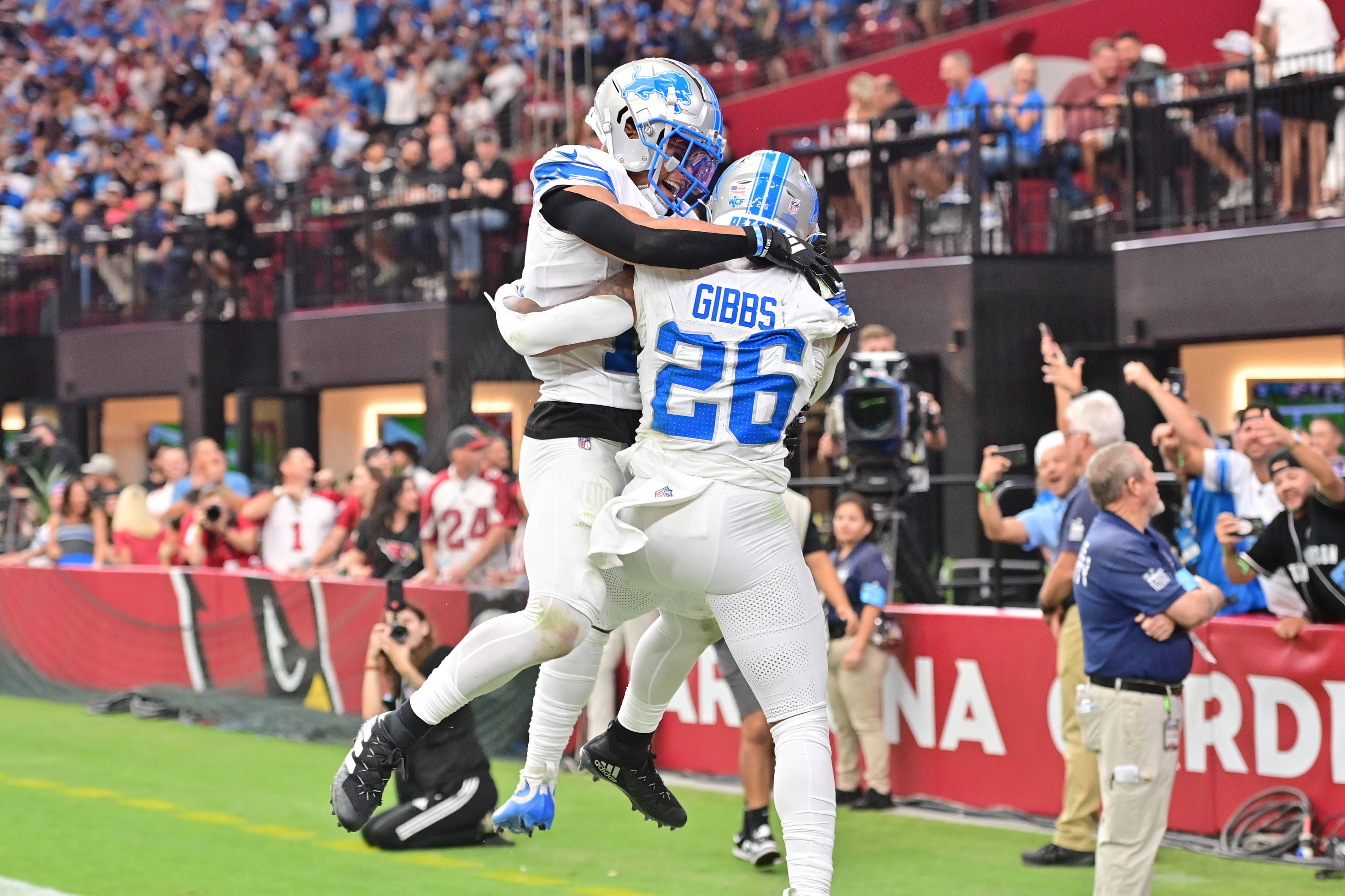 NFL, American Football Herren, USA Detroit Lions at Arizona Cardinals Sep 22, 2024; Glendale, Arizona, USA; Detroit Lions running back Jahmyr Gibbs (26) celebrates with wide receiver Amon-Ra St. Br...