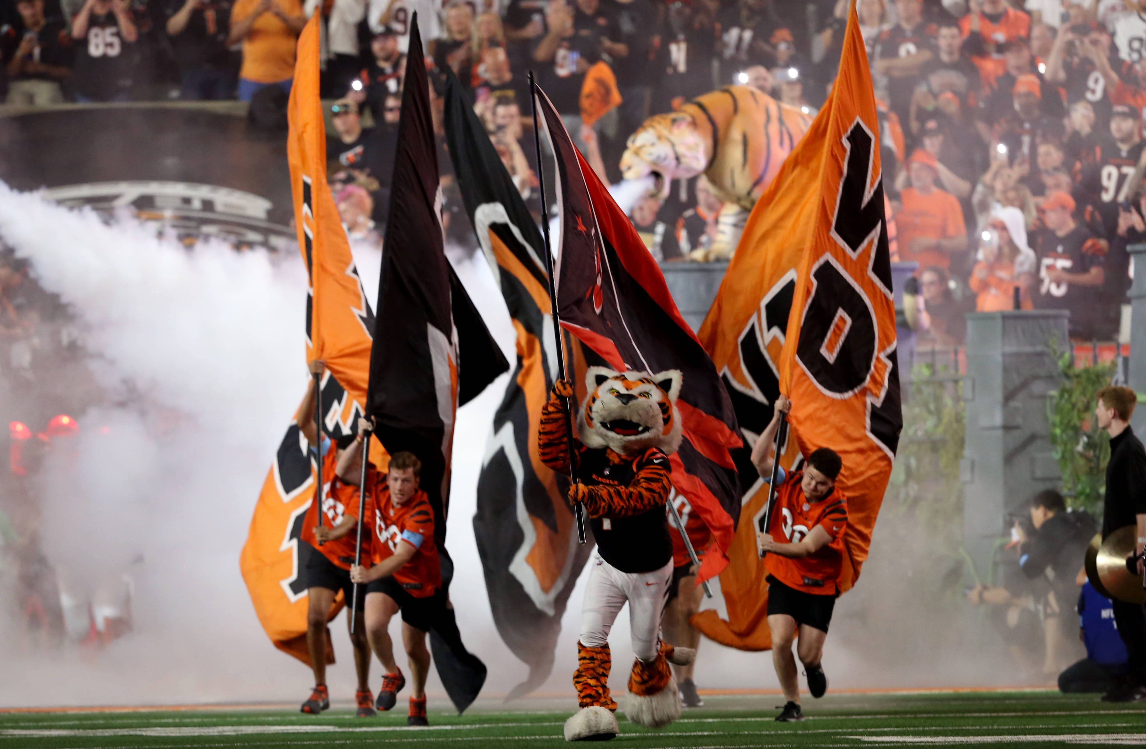 Cincinnati Bengals mascot leads his team on the field before their game against the Washington Commanders at Paycor Stadium on Monday, September 23, 2024 in Cincinnati. Ohio PUBLICATIONxINxGERxSUIx...