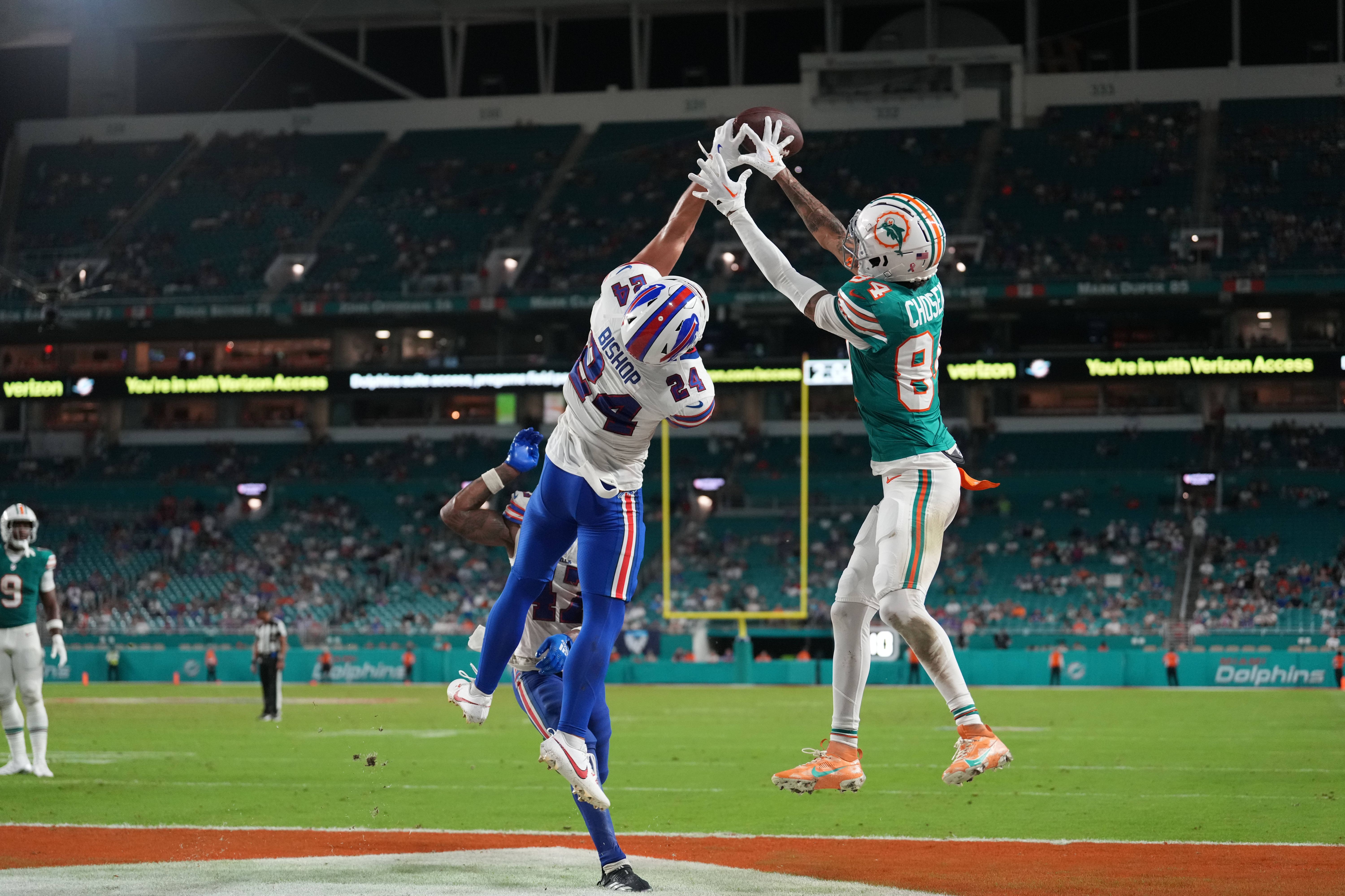 MIAMI GARDENS, FL - SEPTEMBER 12: Buffalo Bills safety Cole Bishop (24) knocks the ball from Miami Dolphins wide receiver Robbie Chosen (84) during the game between the Buffalo Bills and the Miami ...