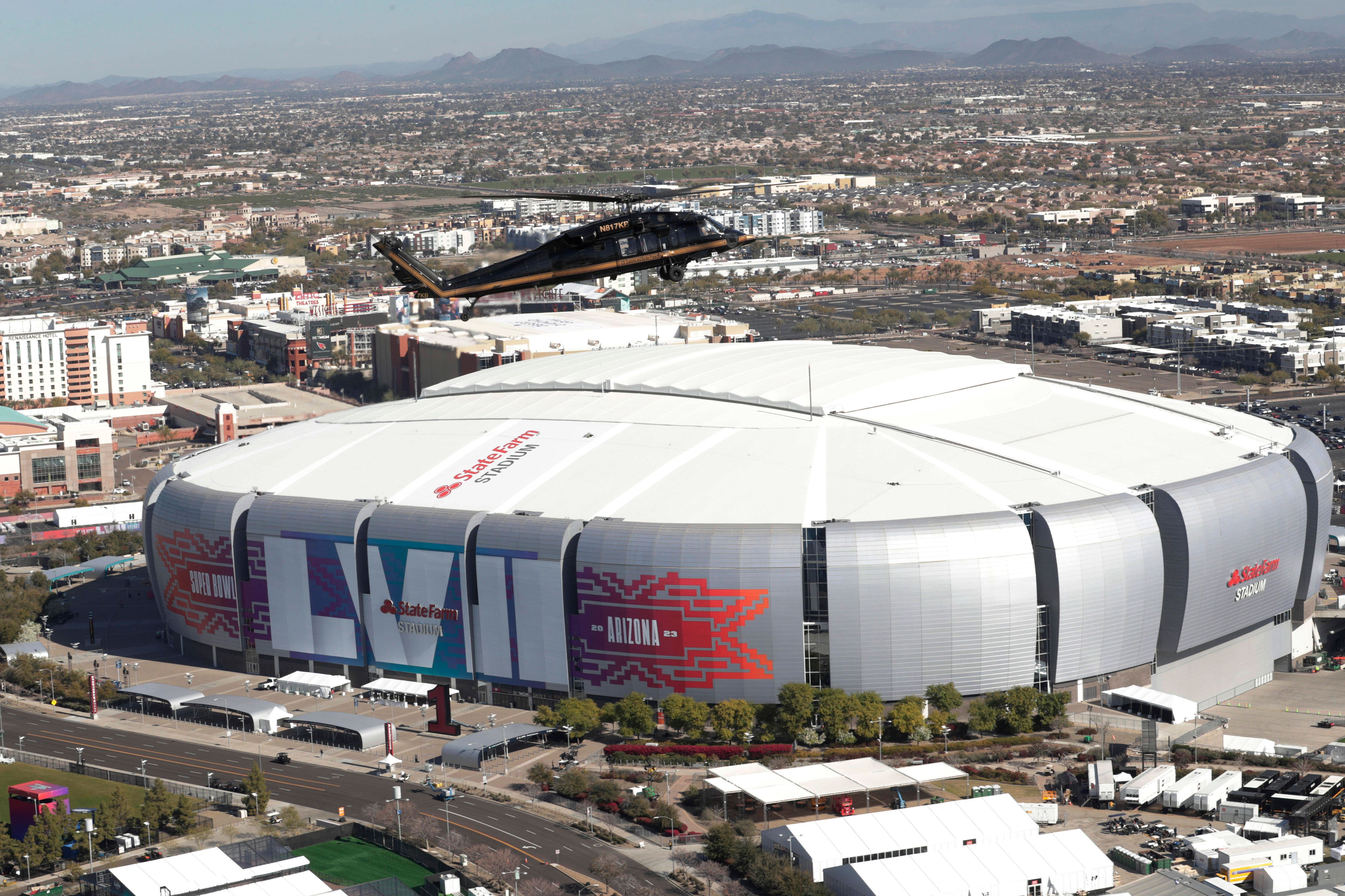 February 6, 2023, Glendale, AZ, United States: A U.S Customs and Border Protection Air and Marine Operations UH-60 Black Hawk helicopter conducts a flyover of State Farm Stadium during a security c...