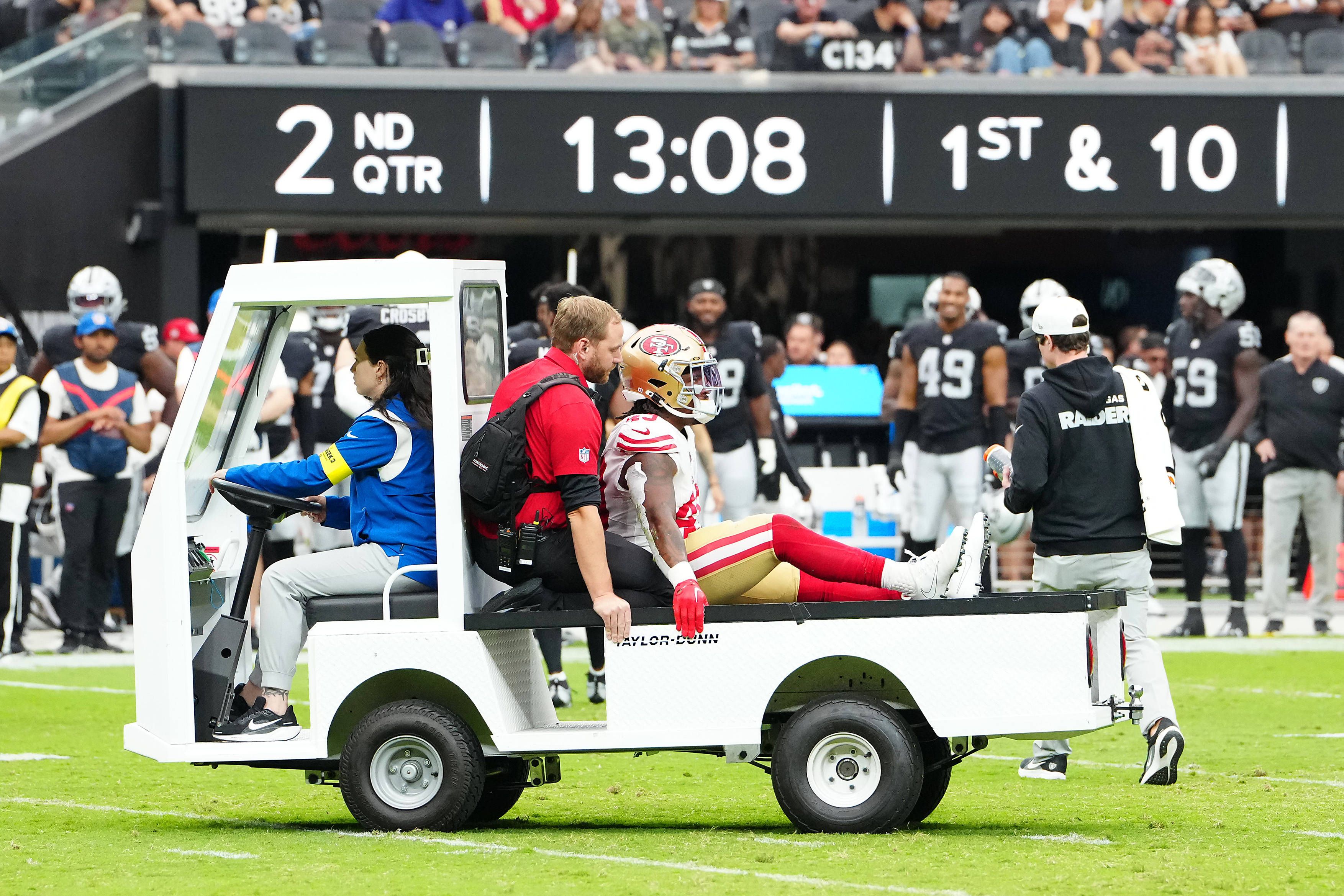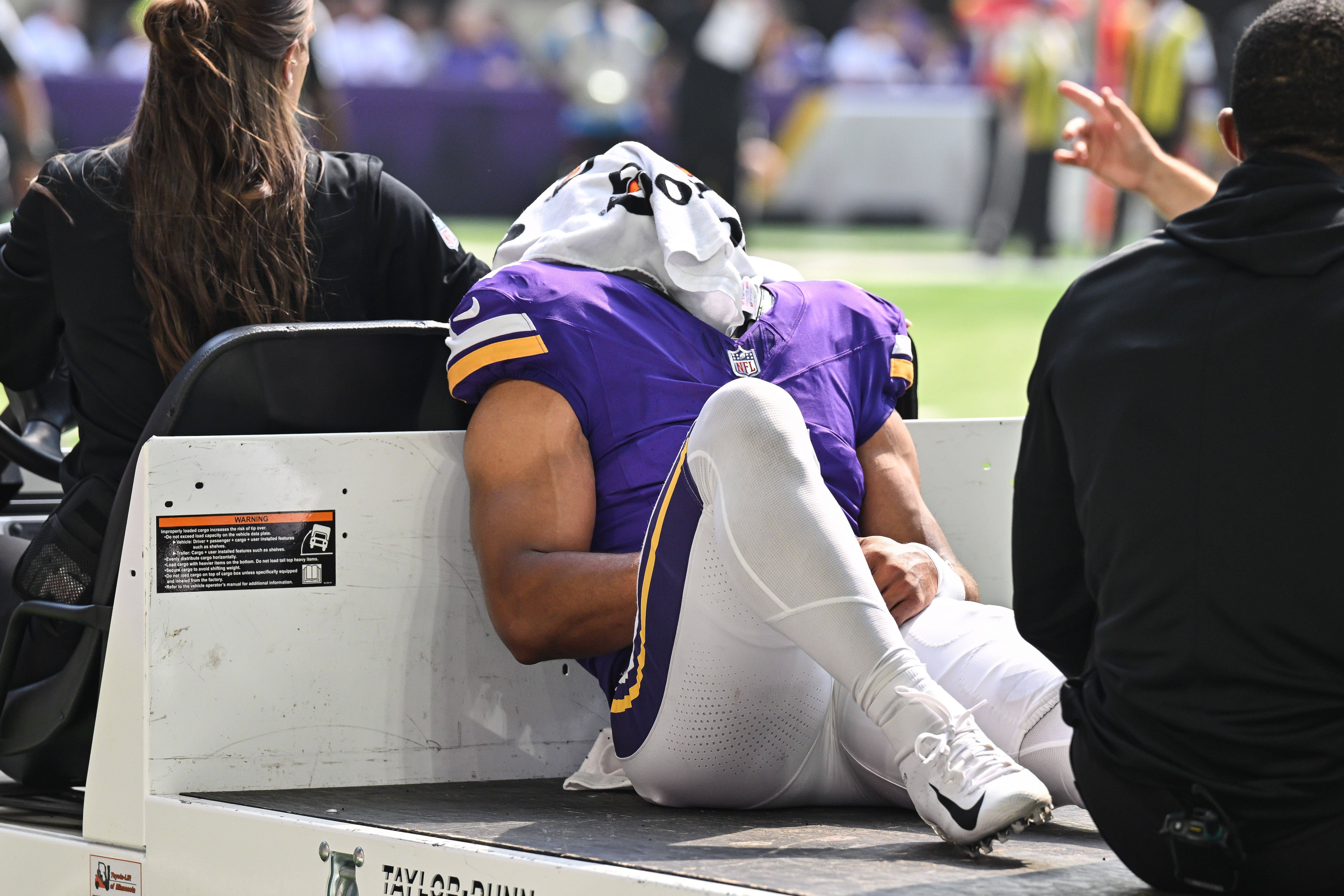 NFL, American Football Herren, USA Houston Texans at Minnesota Vikings Aug 9, 2025; Minneapolis, Minnesota, USA; Minnesota Vikings wide receiver Rondale Moore (4) is carted off the field after suff...