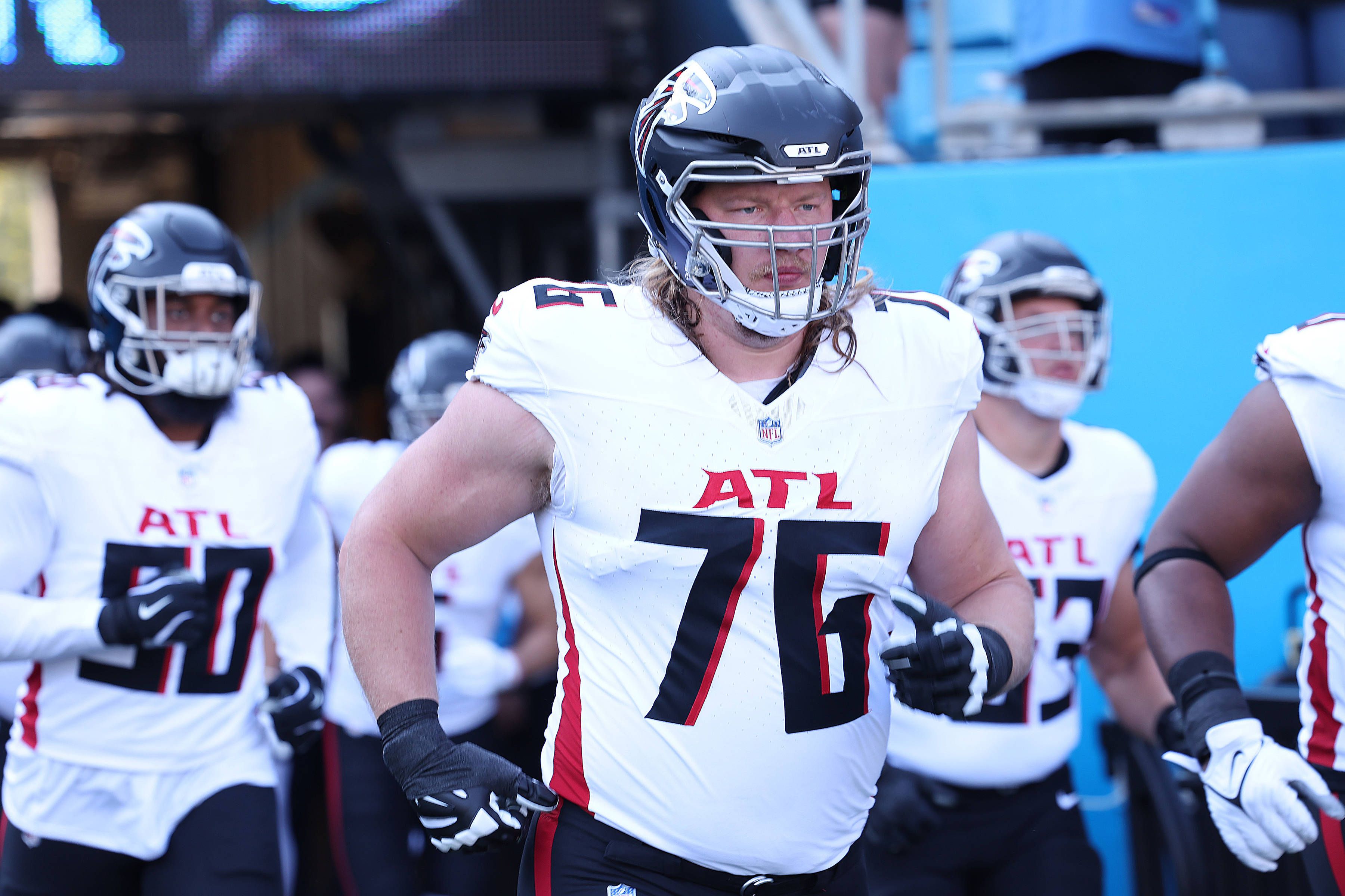 CHARLOTTE, NC - OCTOBER 13: Atlanta Falcons offensive lineman Kaleb McGary (76) during an NFL, American Football Herren, USA football game between the Atlanta Falcons and the Carolina Panthers on O...