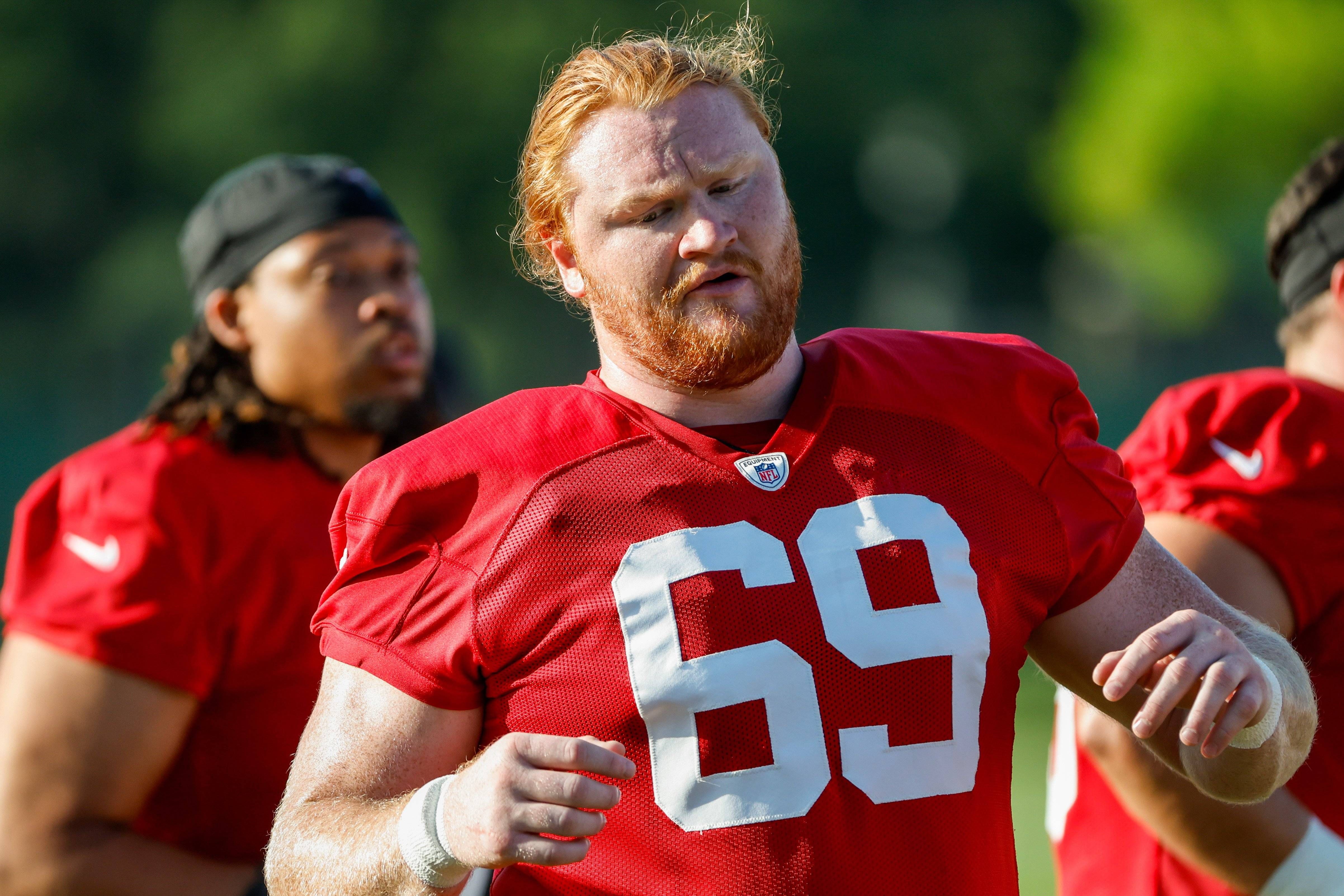 July 27, 2025, Tampa, Florida, USA: Tampa Bay Buccaneers guard Cody Mauch (69) warms up during training camp at the AdventHealth Training Center in Tampa on Sunday, July 27, 2025. Tampa USA - ZUMAs...