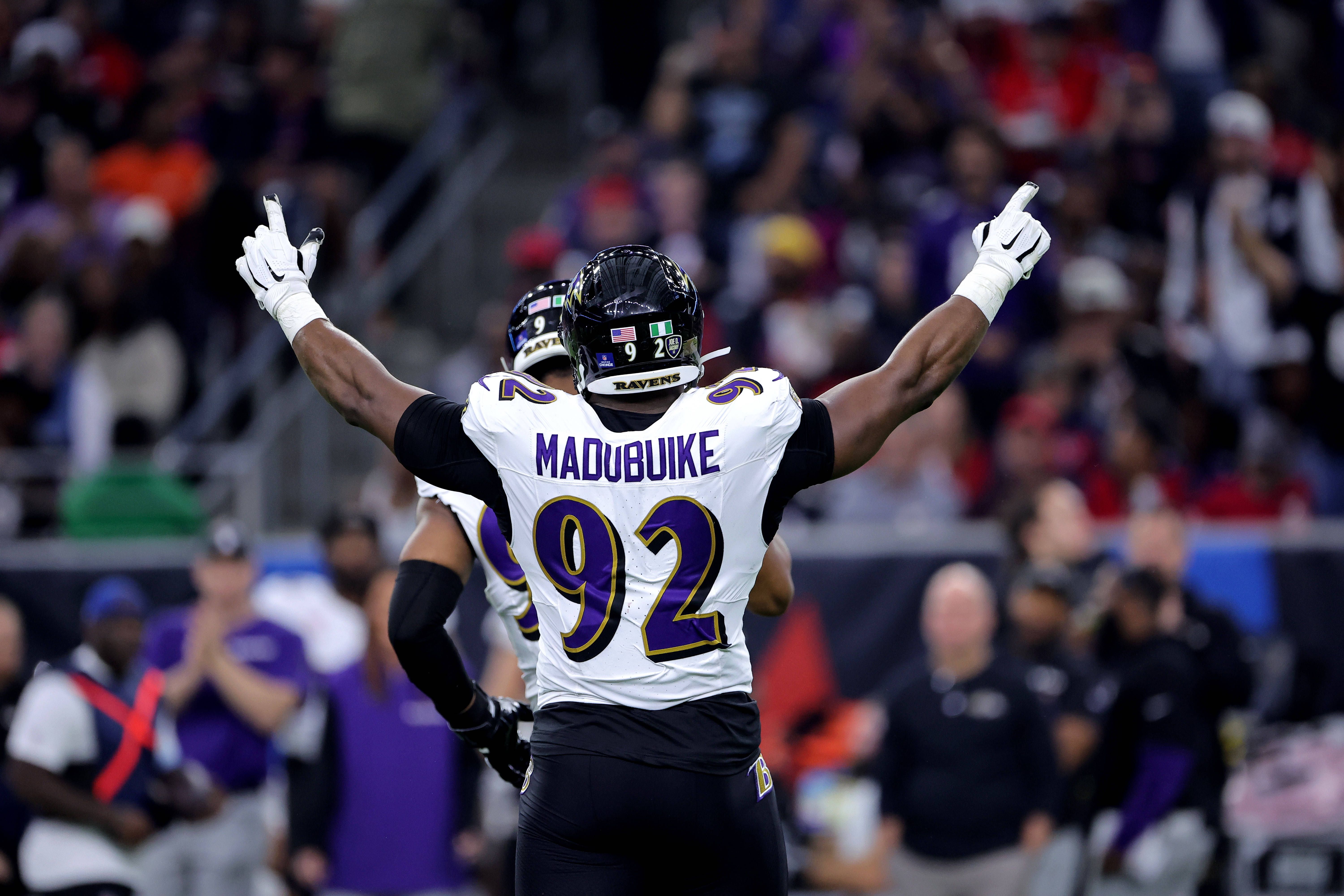 December 25, 2024, Houston, Texas, U.S: Baltimore Ravens defensive tackle Nnamdi Madubuike (92) reacts after a sack by Baltimore Ravens linebacker Odafe Oweh (99, not shown) during the second quart...