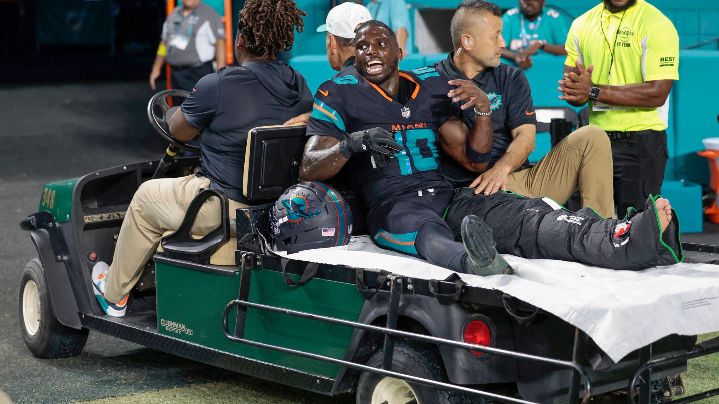 Beim "Monday Night Football"-Spiel der Jets gegen die Dolphins riss sich All-Pro-Receiver Tyreek Hill mehrere Bänder, darunter auch sein Kreuzband. Wie sein Agent nun mitteilte ist die OP gut verlaufen. Glücklicherweise gab es wohl keine Komplikationen. Bei einem normalen Reha-Prozess "wird er nächste Saison für das erste Spiel fit sein."IMAGO/ZUMA Press Wire
