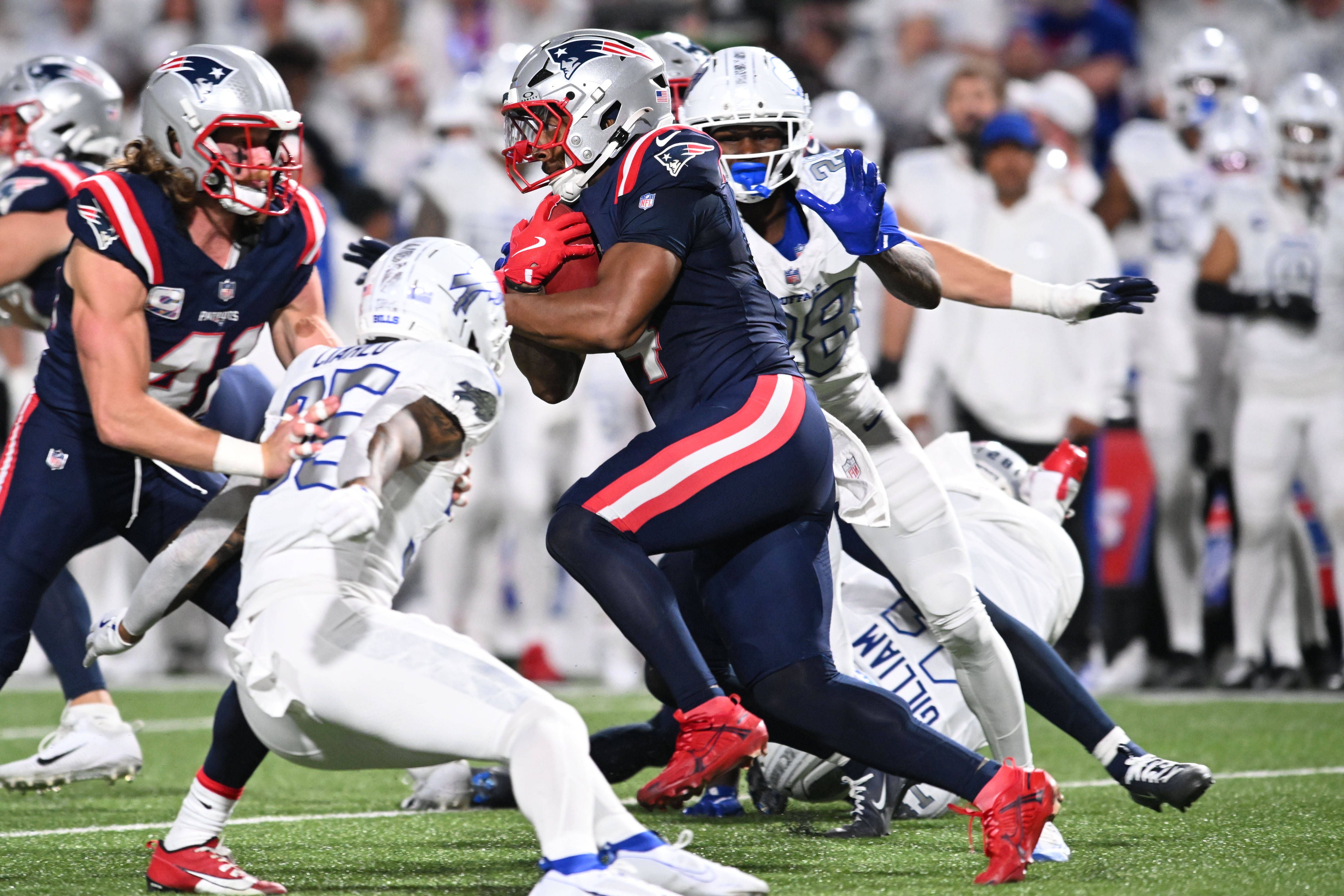 Für Antonio Gibson nahm das Spiel gegen die Buffalo Bills ein abruptes und schmerzhaftes Ende. Im zweiten Viertel verletzte sich der Running Back der New England Patriots bei einem Kickoff-Return schwer am Knie und musste unter Tränen das Spielfeld verlassen. Der 27-Jährige zählt zu den wichtigsten Kickoff-Returnern seines Teams. Inzwischen steht fest: Gibson hat sich das Kreuzband gerissen und wird in der Saison 2025 nicht mehr auflaufen können.IMAGO/Imagn Images