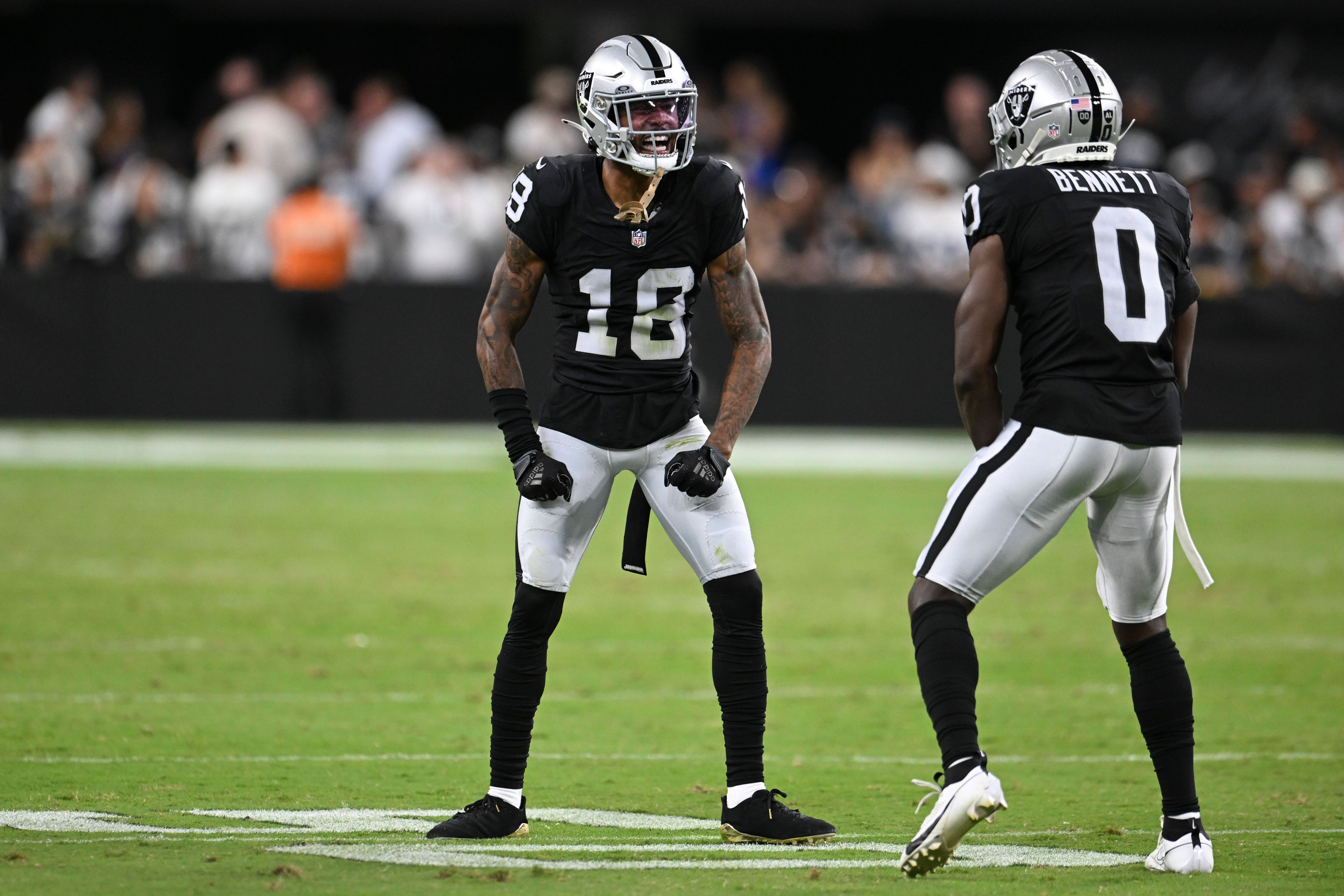 NFL, American Football Herren, USA Dallas Cowboys at Las Vegas Raiders Aug 17, 2024; Paradise, Nevada, USA; Las Vegas Raiders cornerback Jack Jones (18) and cornerback Jakorian Bennett (0) celebrat...