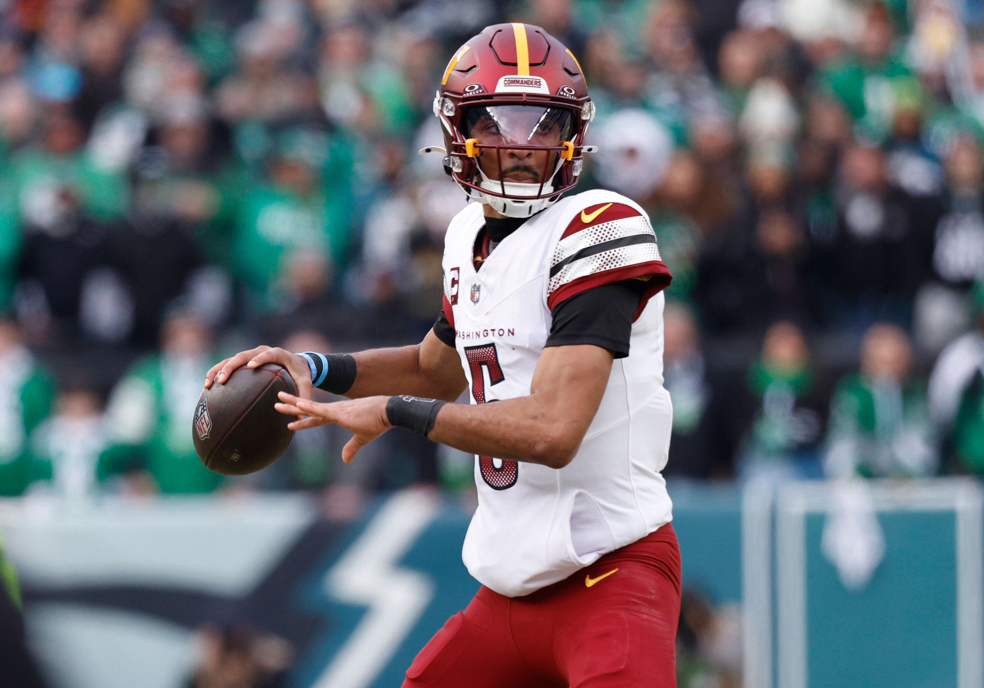 Washington Commanders quarterback Jayden Daniels (5) drops back to pass against the Philadelphia Eagles in the first quarter of the NFC Championship game at Lincoln Financial Field in Philadelphia,...