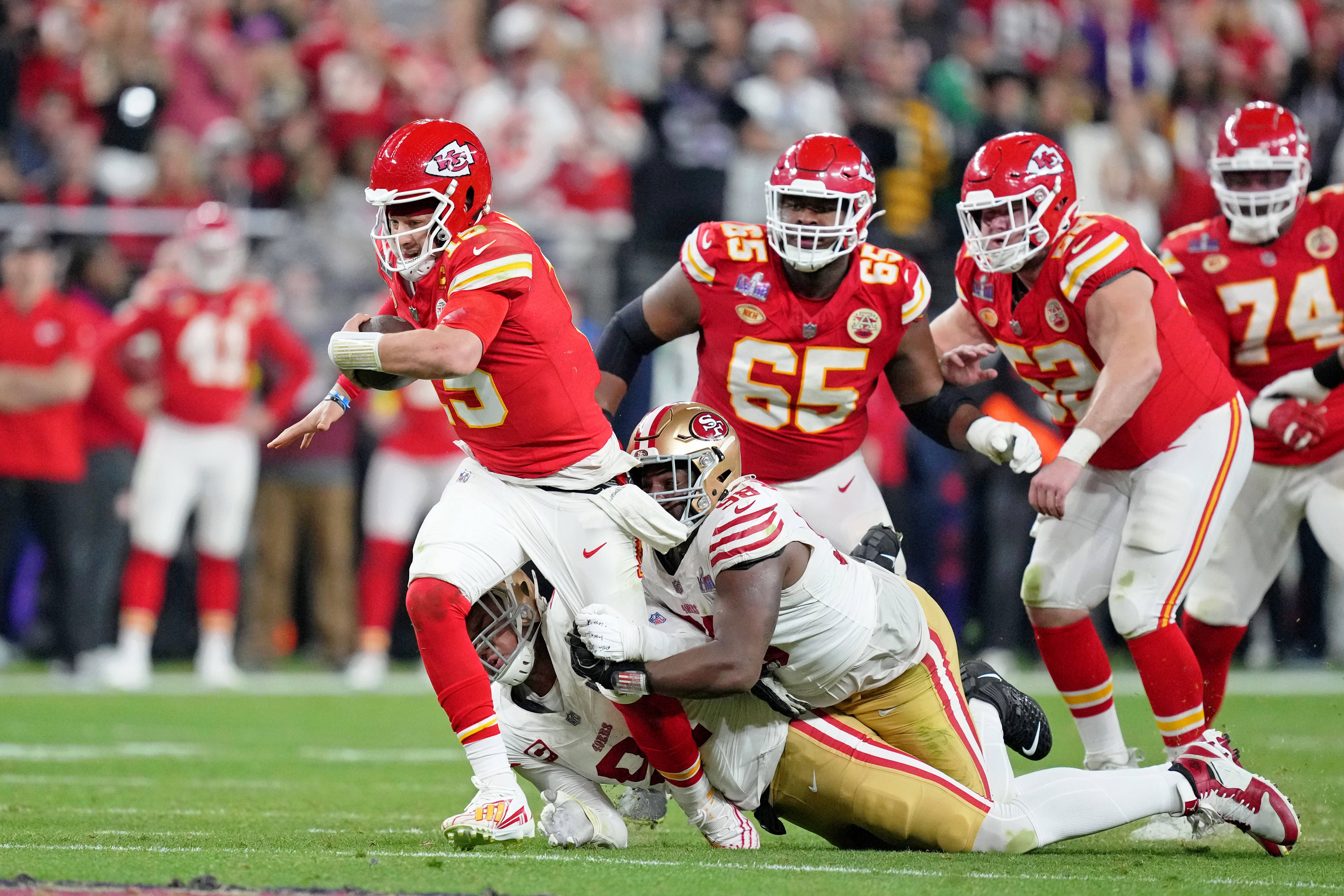 NFL, American Football Herren, USA Super Bowl LVIII-San Francisco 49ers at Kansas City Chiefs Feb 11, 2024; Paradise, Nevada, USA; Kansas City Chiefs quarterback Patrick Mahomes (15) runs with the ...