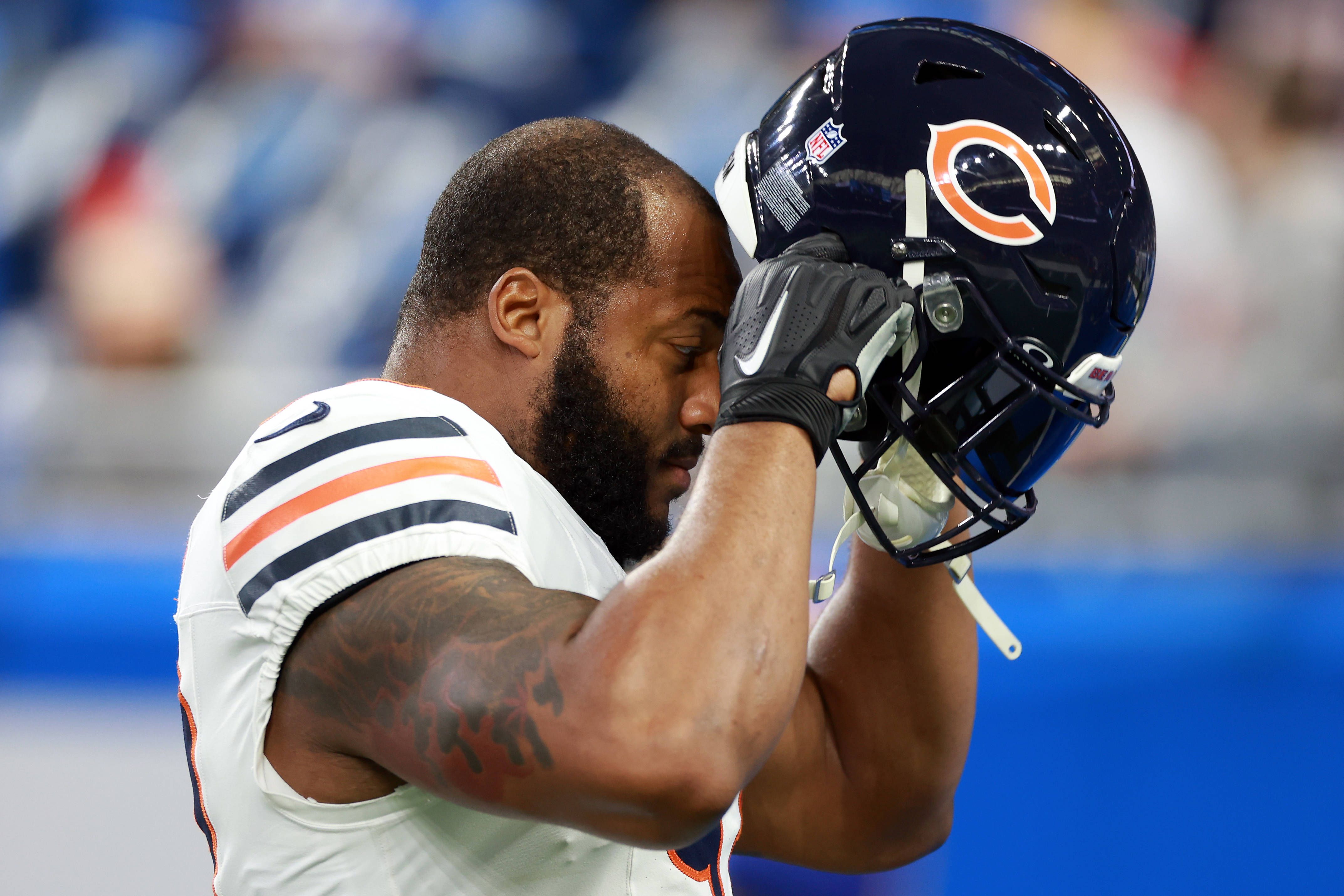 Chicago Bears vs. Detroit Lions DETROIT,MICHIGAN-NOVEMBER 28: Defensive end Montez Sweat (98) of the Chicago Bearsputs on his helmet on the field ahead of a game between the Detroit Lions and the C...