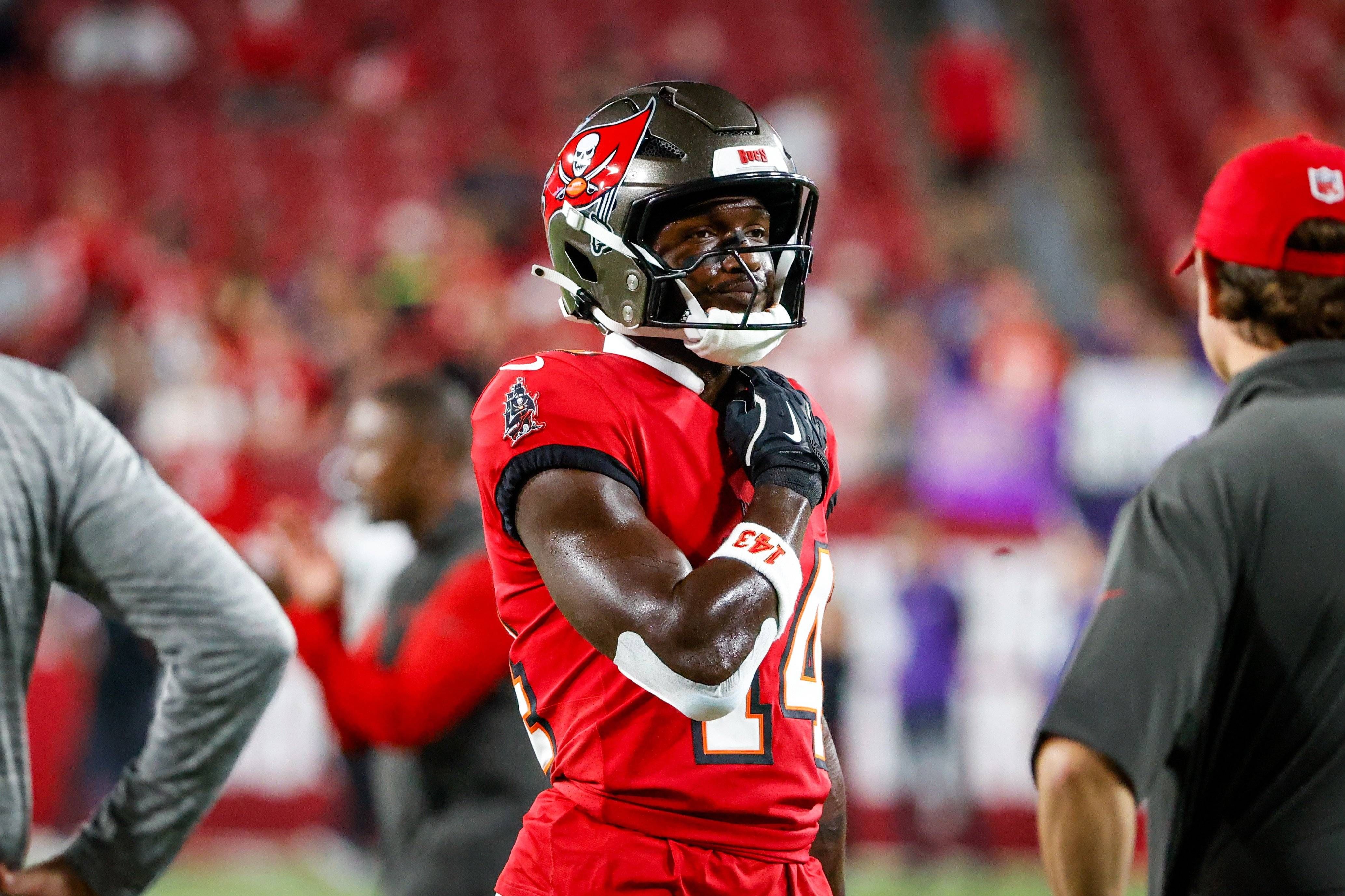October 21, 2024, Tampa, Florida, USA: Tampa Bay Buccaneers wide receiver Chris Godwin (14) warms up ahead of a game against the Baltimore Ravens at Raymond James Stadium in Tampa on Monday, Oct. 2...