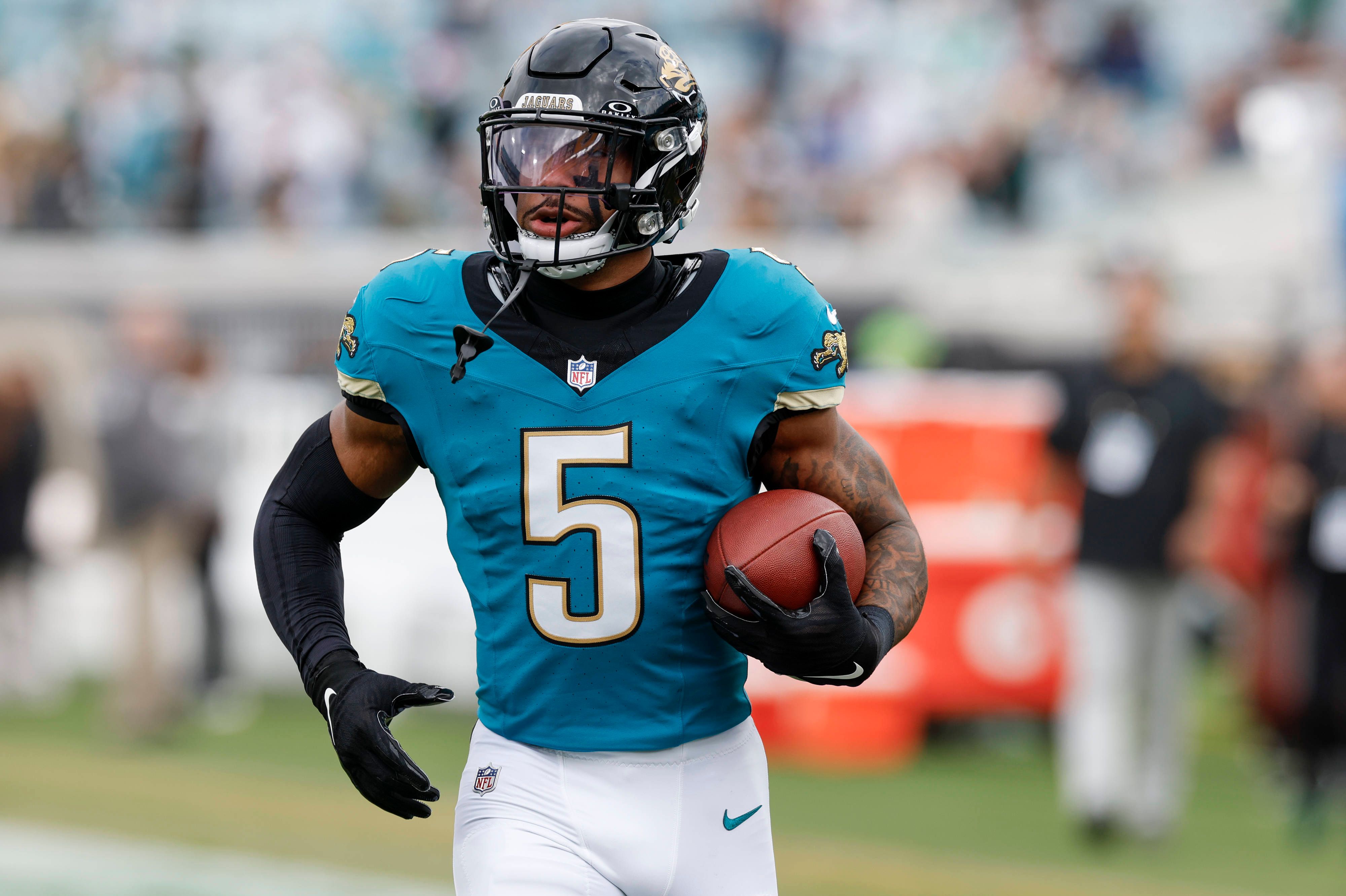 JACKSONVILLE, FL - DECEMBER 15: Jacksonville Jaguars safety Andre Cisco (5) warms up before the game between the Jacksonville Jaguars and the New York Jets on December 15, 2024 at EverBank Stadium ...