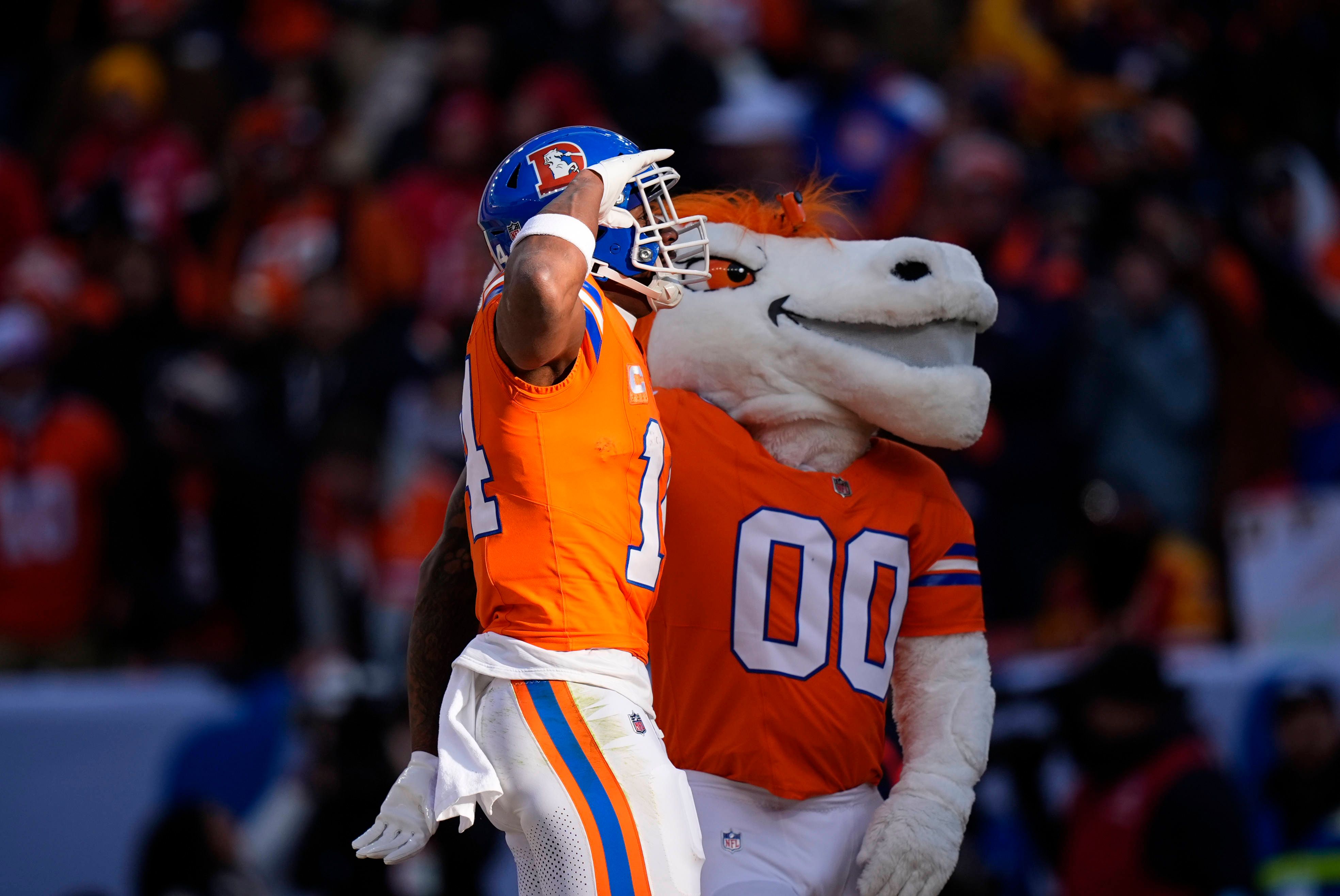 NFL, American Football Herren, USA Kansas City Chiefs at Denver Broncos Jan 5, 2025; Denver, Colorado, USA; Denver Broncos wide receiver Courtland Sutton (14) celebrates his touchdown reception in ...