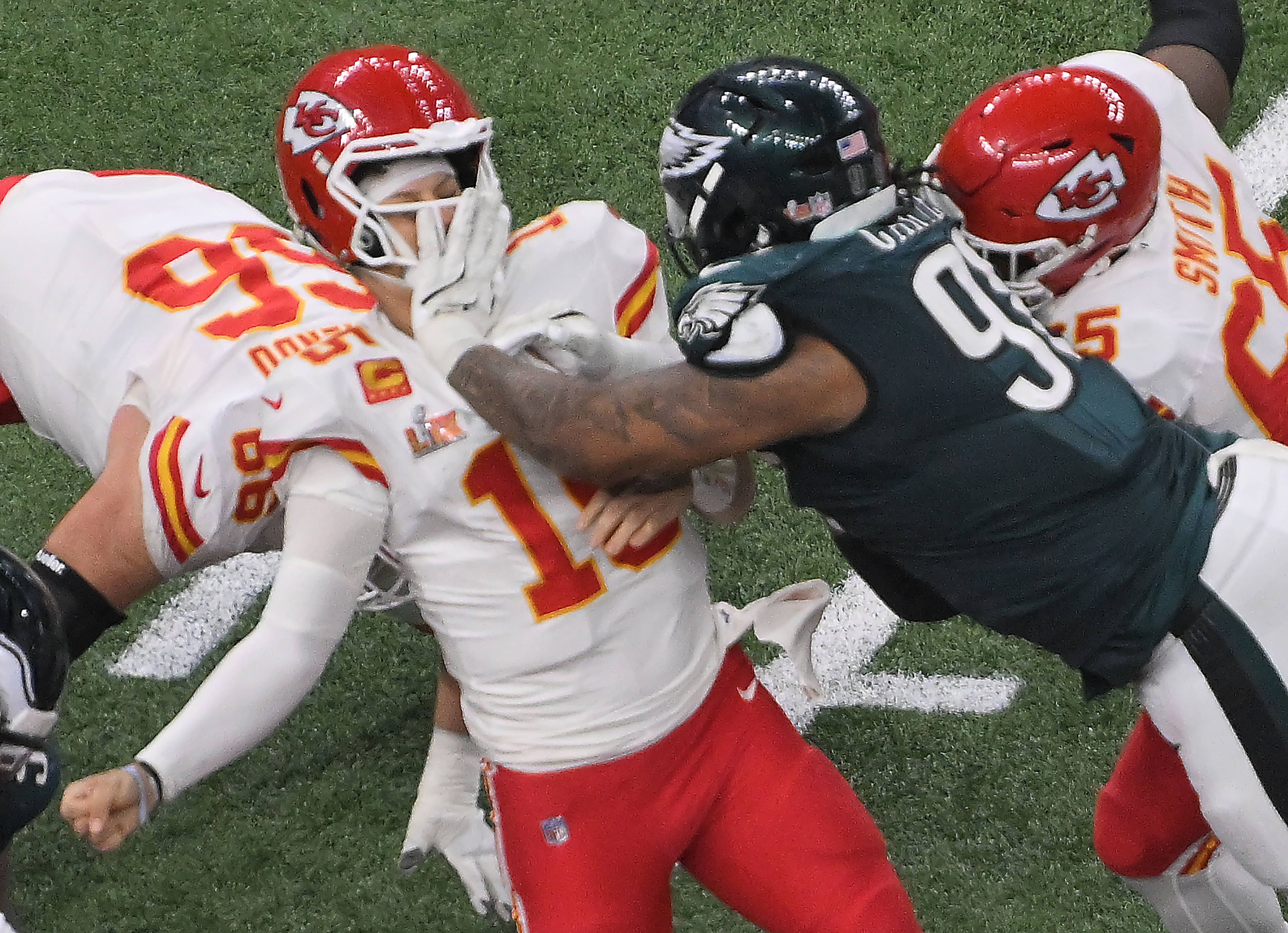 Philadelphia Eagles defensive tackle Jalen Carter (98) grabs Kansas City Chiefs quarterback Patrick Mahomes (15) in the face mask in the fourth quarter in Super Bowl LIX at Caesars Superdome in New...