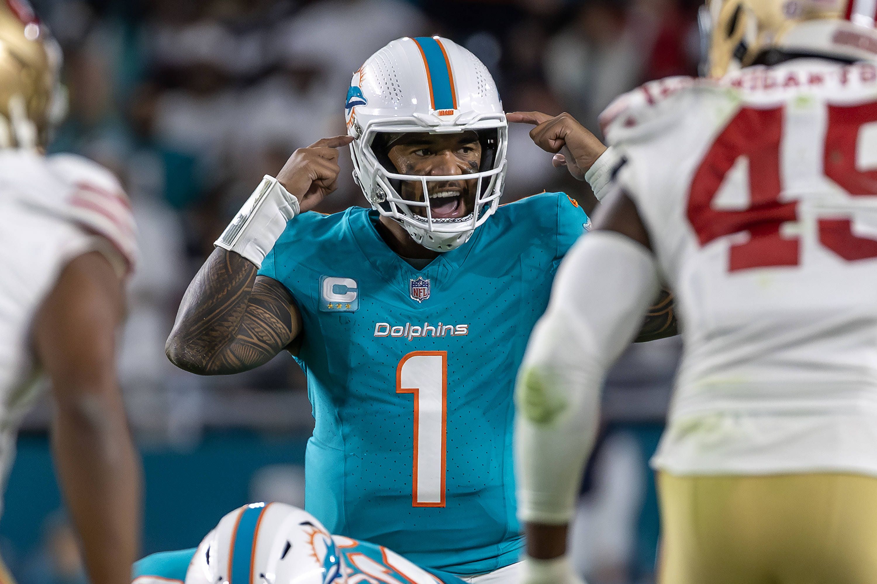 December 22, 2024, Miami Gardens, Florida, USA: Miami Dolphins quarterback Tua Tagovailoa (1) calls a play during the second half of their NFL, American Football Herren, USA game against the San Fr...