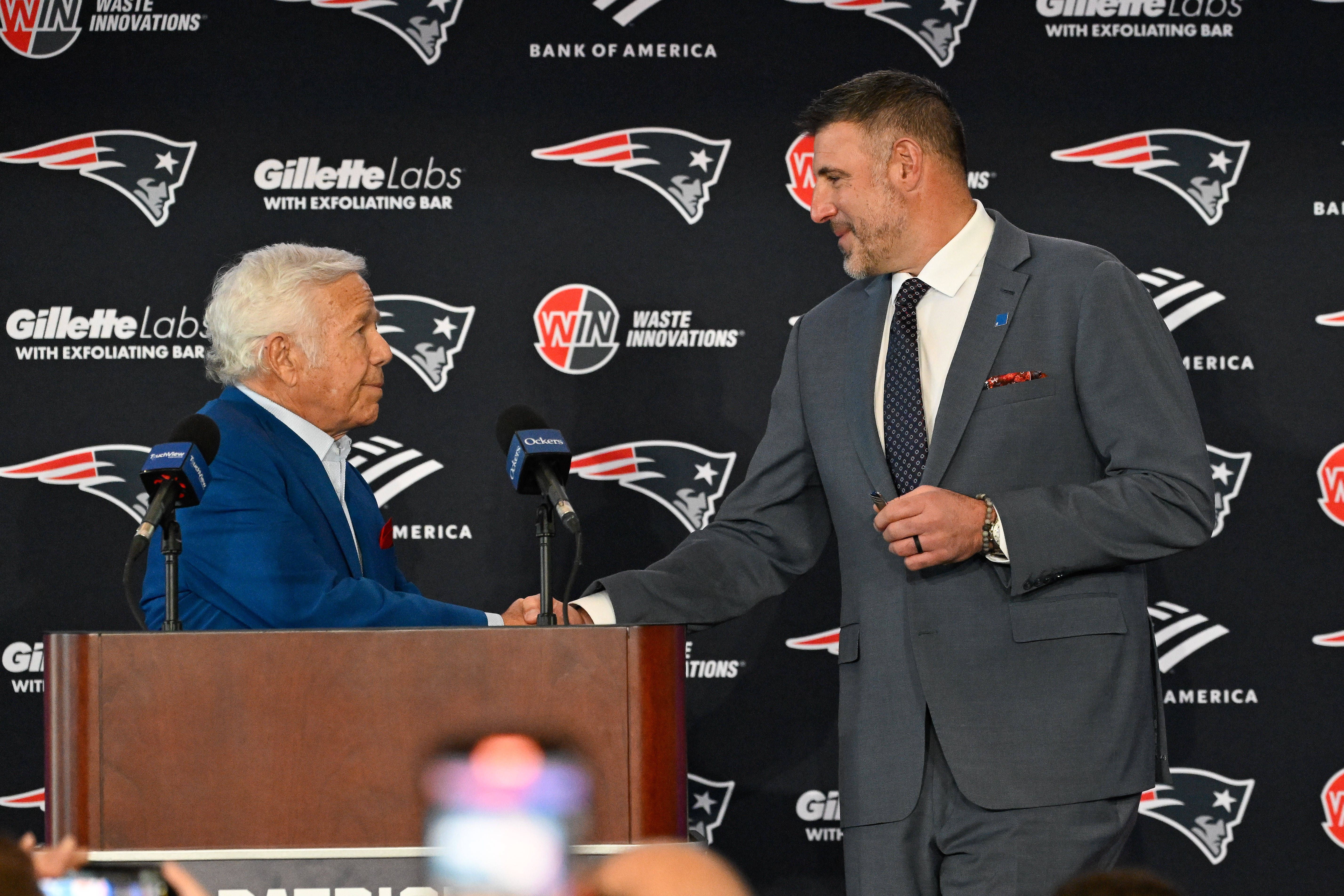 NFL, American Football Herren, USA New England Patriots Mike Vrabel press conference, PK, Pressekonferenz Jan 13, 2025; Foxborough, MA, USA; New England Patriots owner Robert Kraft (left) introduce...